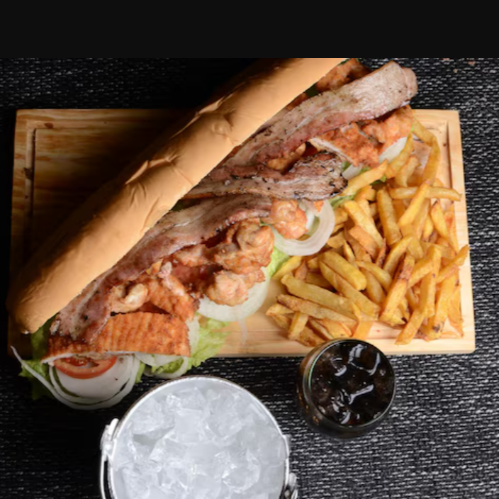 200 g De carne premium de picaña, chorizo, queso blanco gratinado, jamón, lechuga y tomate bañada de queso americano con trocitos de tocino acompañada de papas a la francesa.