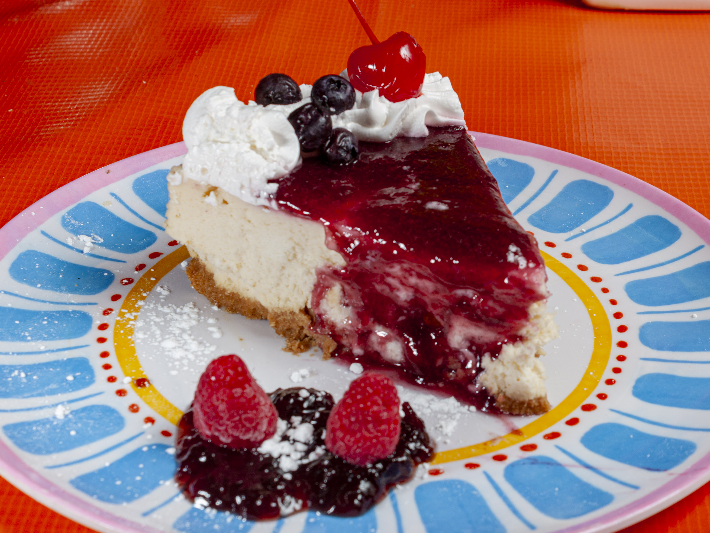 Pastel cremoso de queso cubierto con mermelada de zarzamora y decorado con crema batida rebanada de 150 gr.