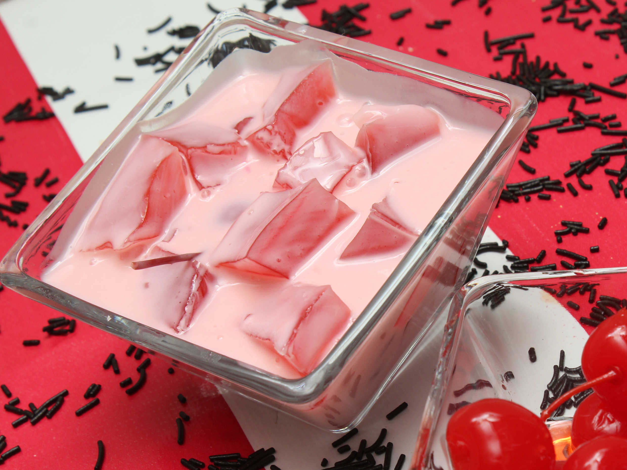 Vaso de 12 oz, gelatina de cereza con base de yogurt y trozos de cerezas.