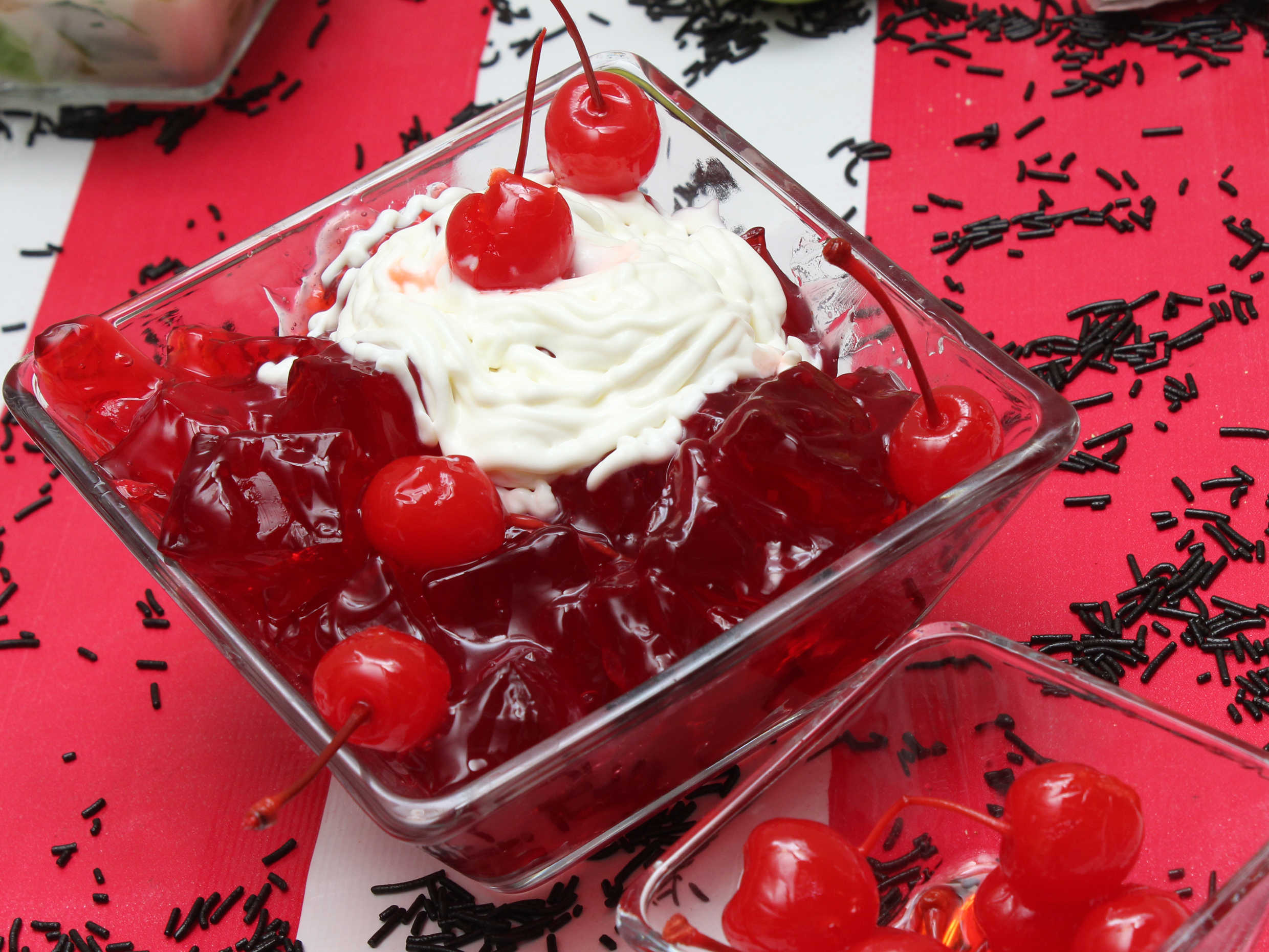 Vaso de 12 oz, gelatina de cereza con base de dulce caramelizado de cereza y trozos de cereza.