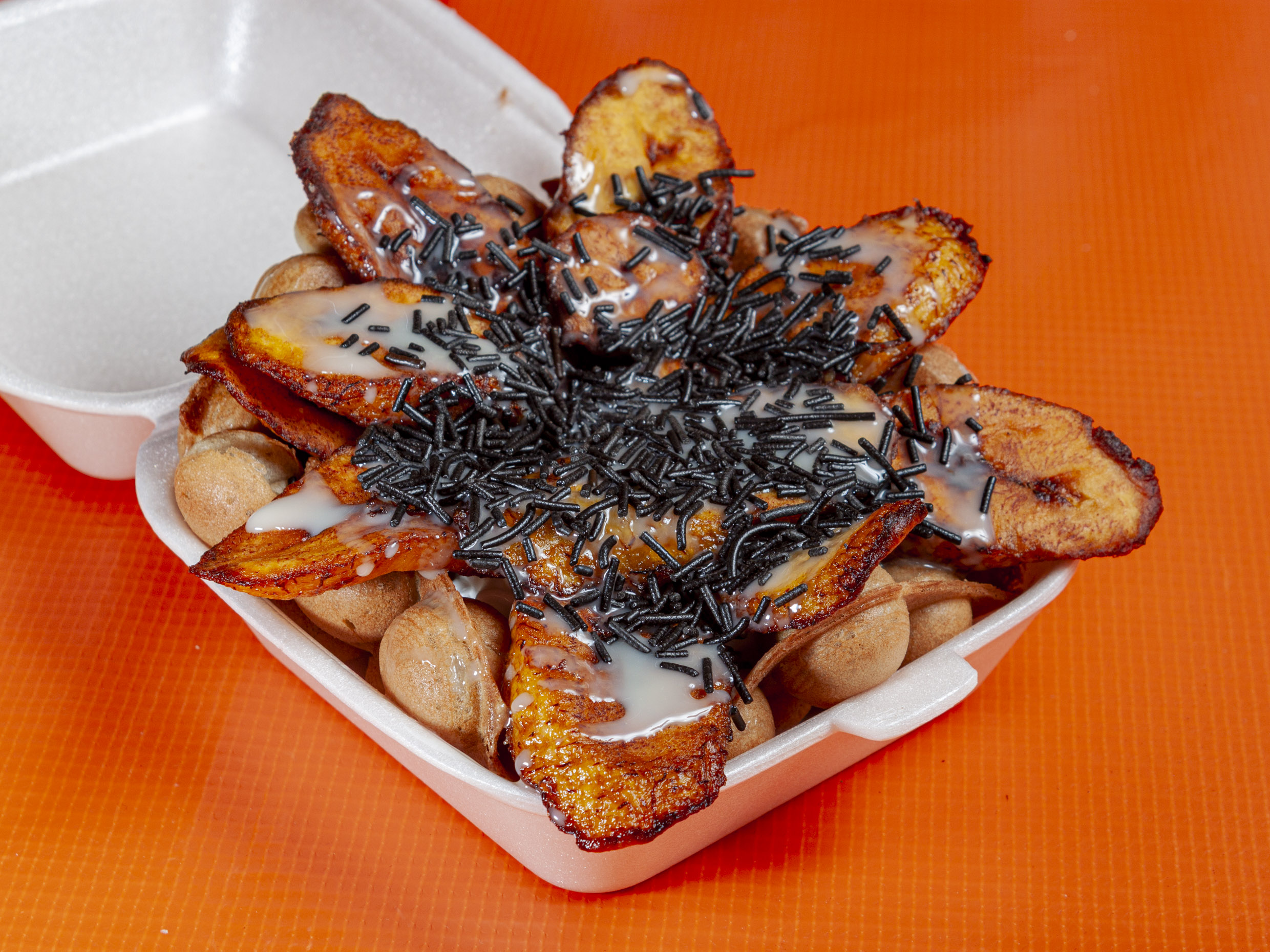Waffle relleno de helado, chantillí, plátanos fritos, mermelada de fresa y chispas de chocolate.