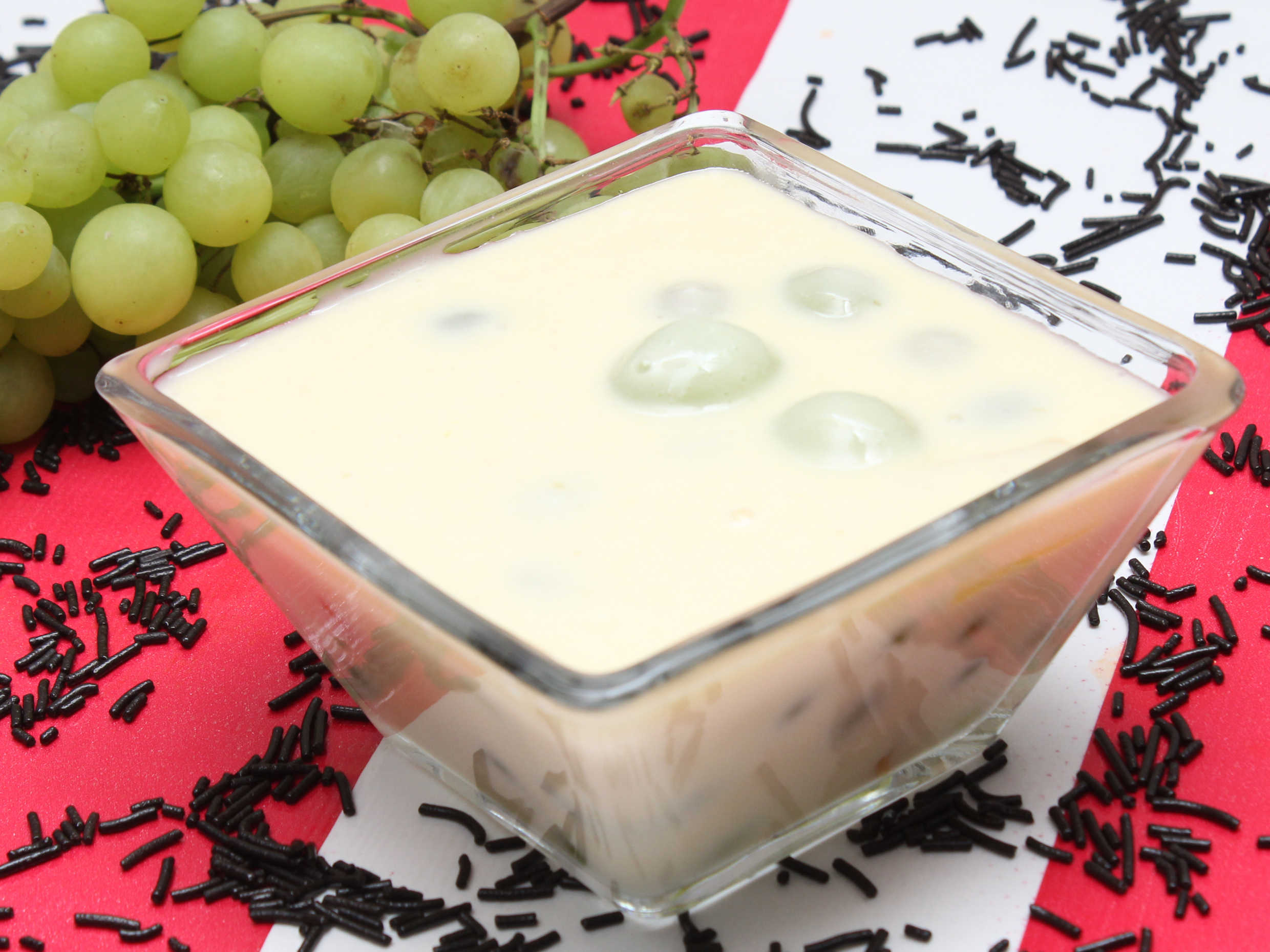 Vaso de 12 oz, uvas frescas acompañadas de queso cottage, queso crema y bañadas de crema.
