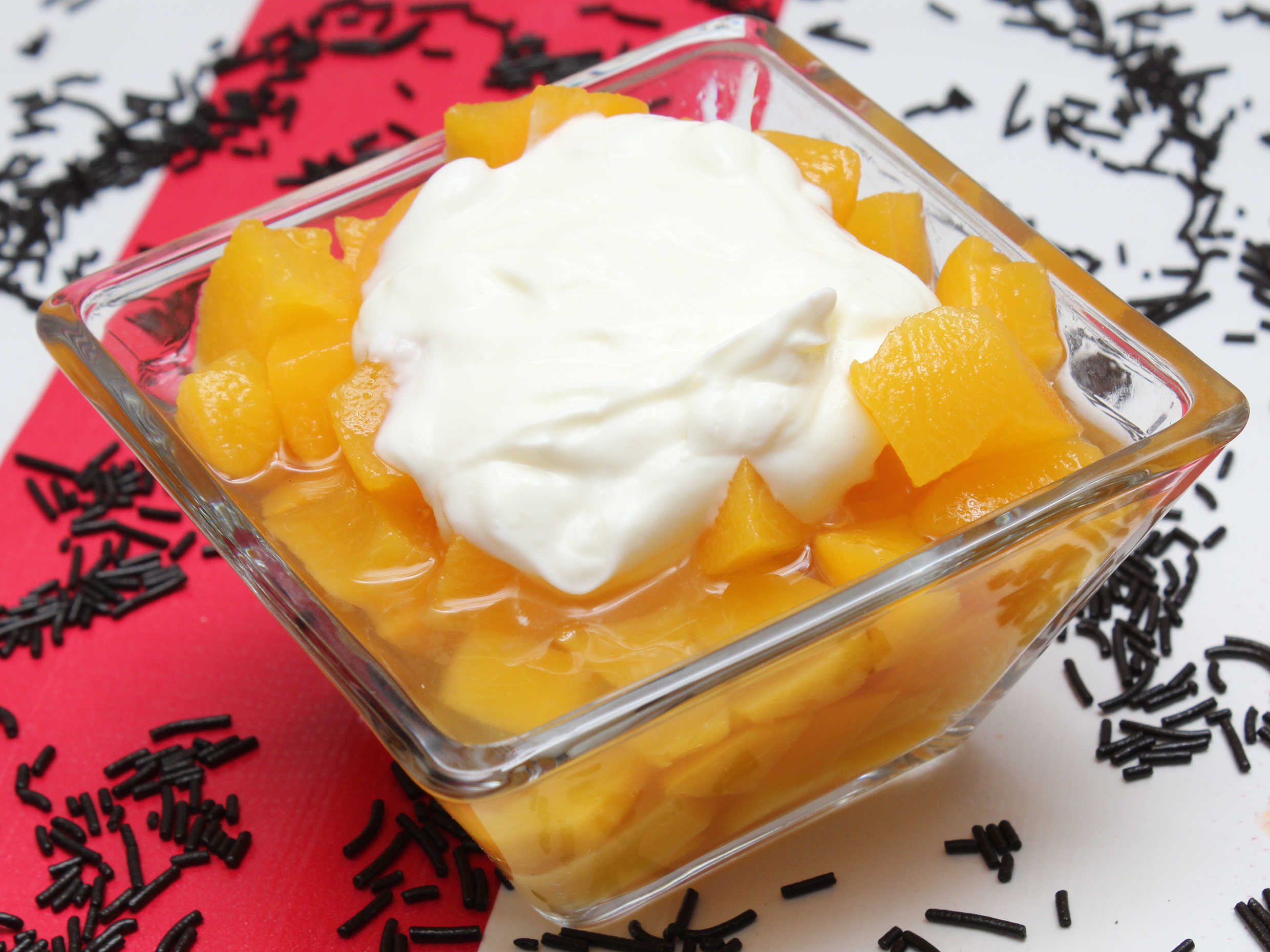 Vaso de 12 oz, gelatina de durazno con base de yogurt y pequeños trozos de durazno.