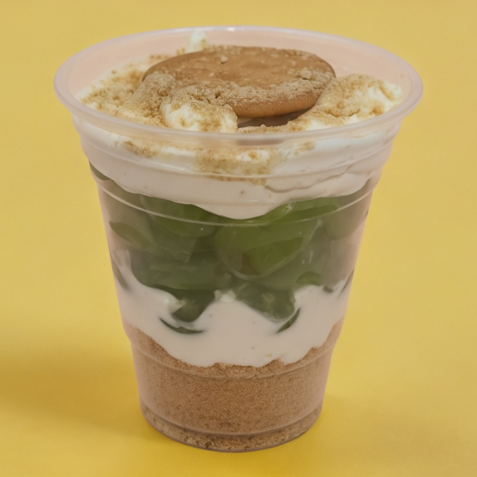 Vaso con 220 grs de Uvas con crema, porción individual. Delicioso postre con una base de galleta triturada, crema preparada con la receta de la casa y uvas frescas.