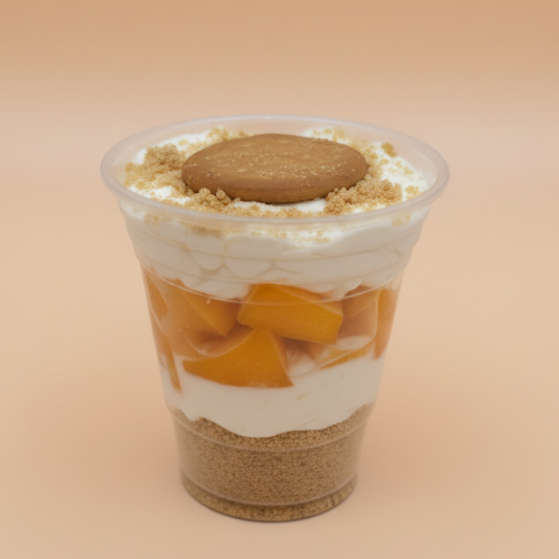 Vaso con 220 grs de Duraznos con crema, porción individual. Delicioso postre con una base de galleta triturada, crema preparada con la receta de la casa y duraznos en almibar.