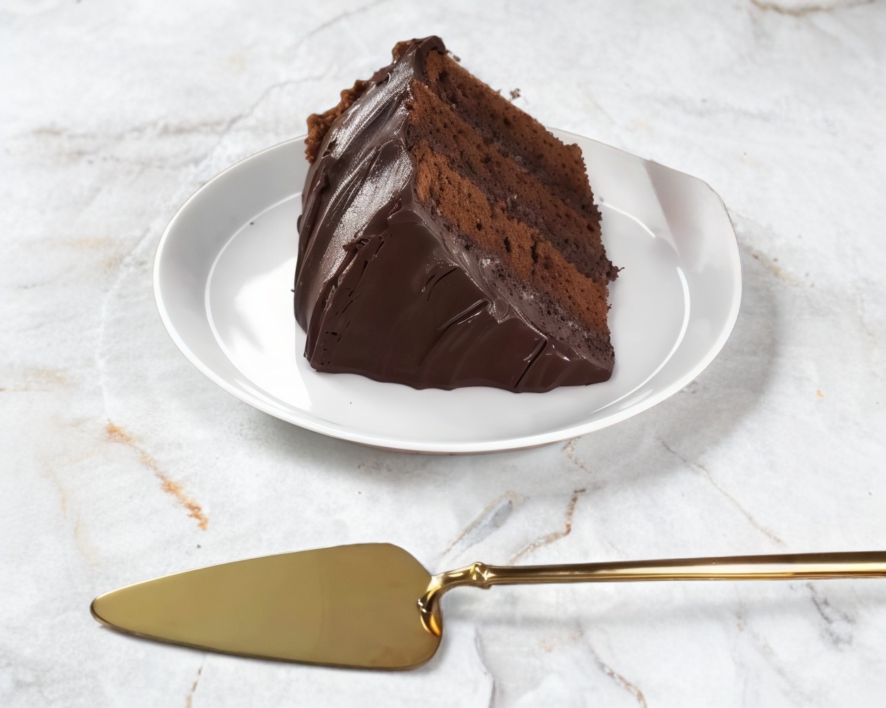 Pastel hecho a base de panqué de chocolate con relleno y decorado de ganache de chocolate.
