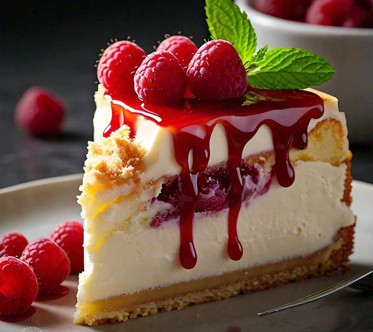 Base de galleta molida, decorado con jalea de frambuesa y crema batida.