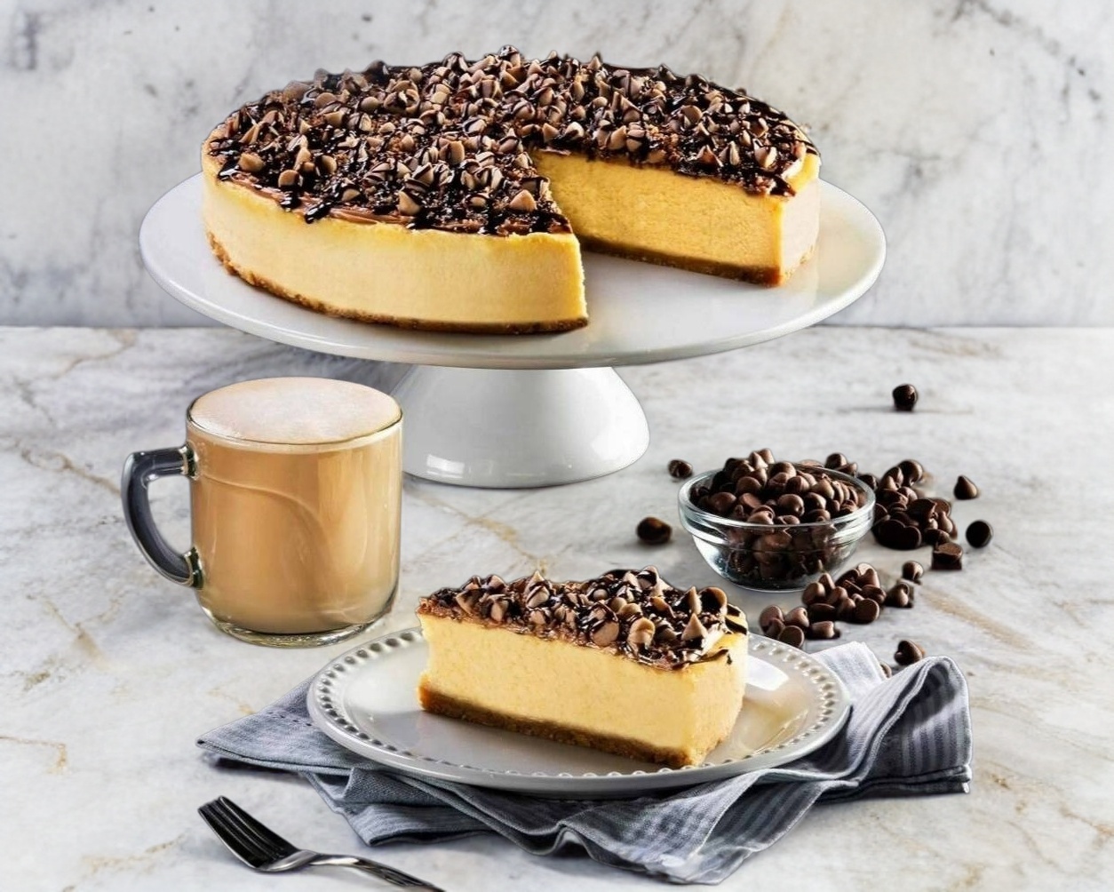 Rebanada de pastel, elaborado con queso crema, base de galleta graham cracker, chispas de chocolate, nuez y cajeta.