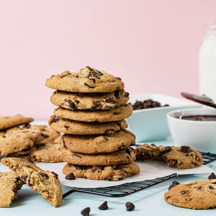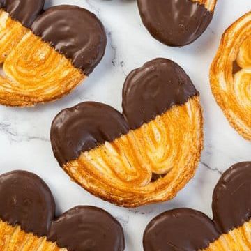 3 piezas de mini orejitas con chocolate. Pan de hojaldre horneado con azúcar cubierto con chocolate.