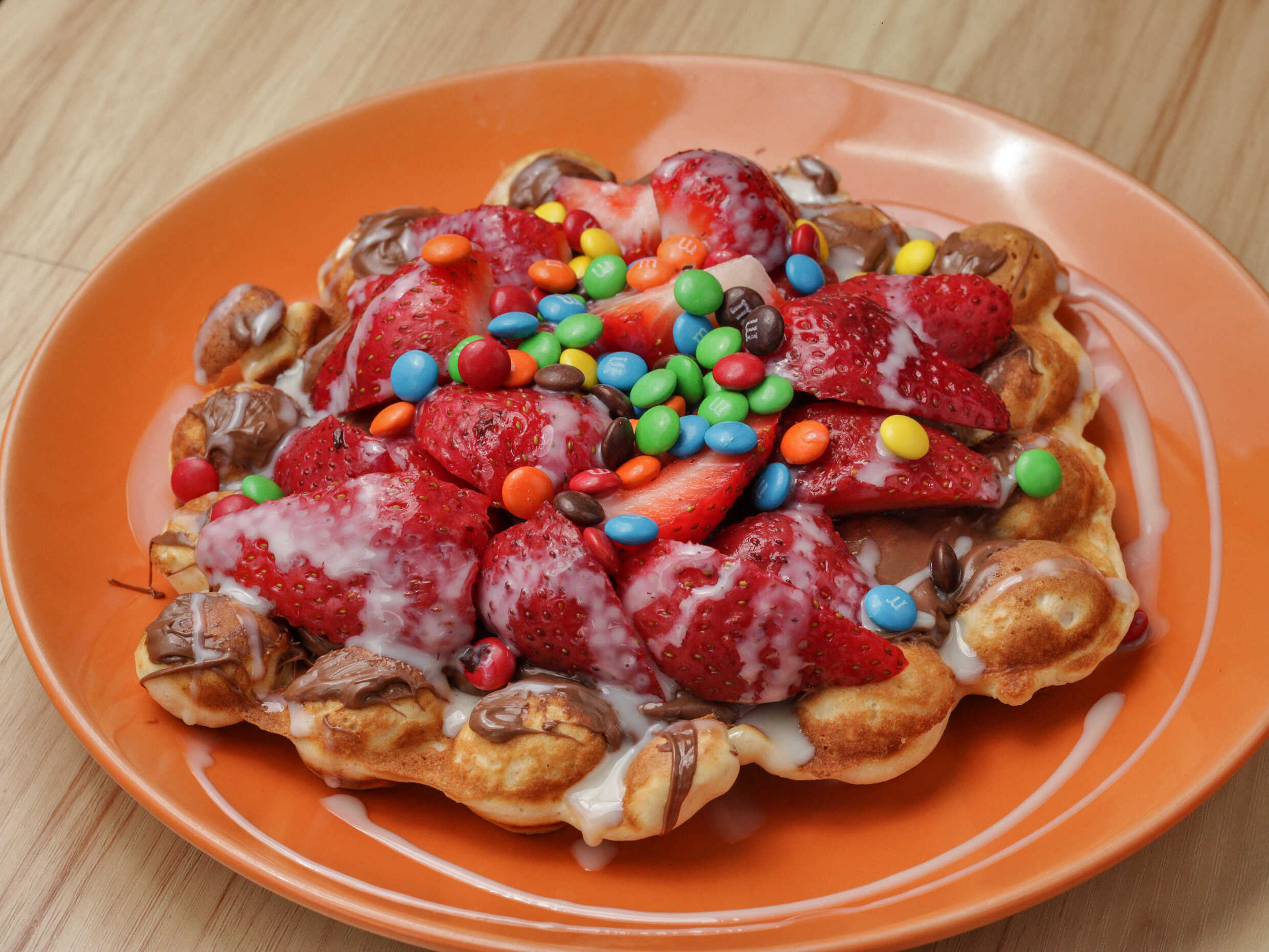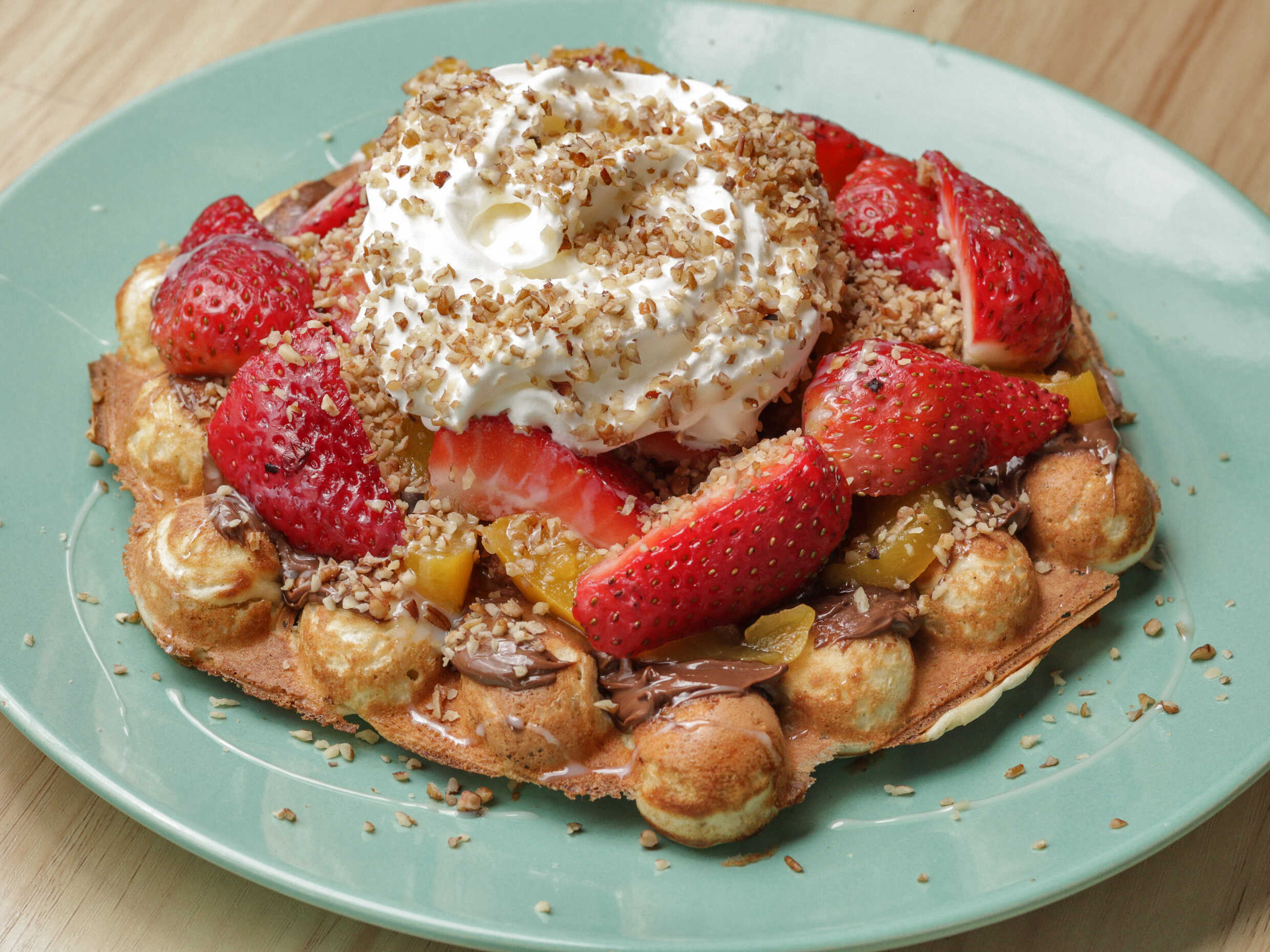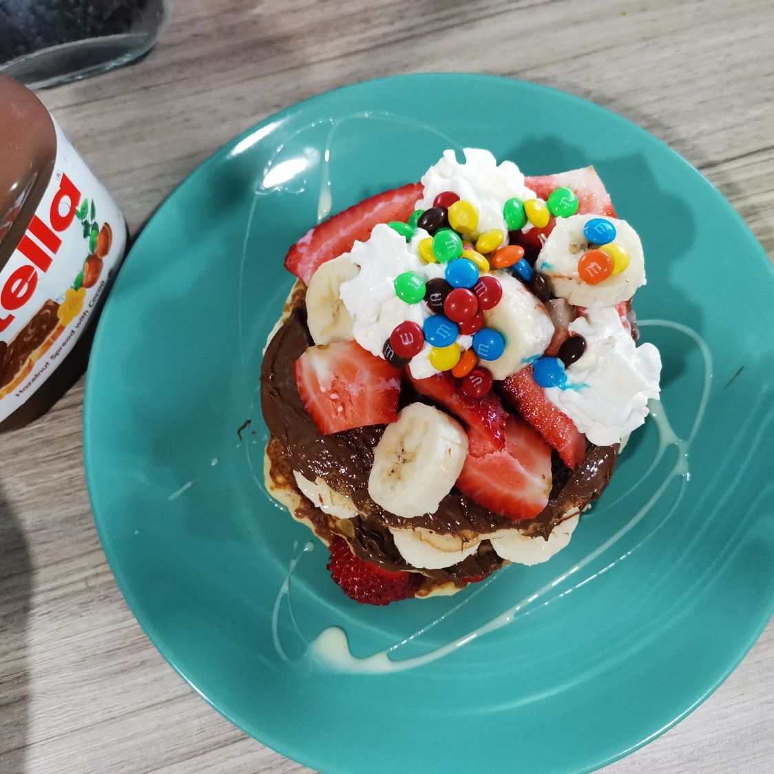 crepa rellena de nutella, avellana y fresa decorada con crema batida y conejo turin
