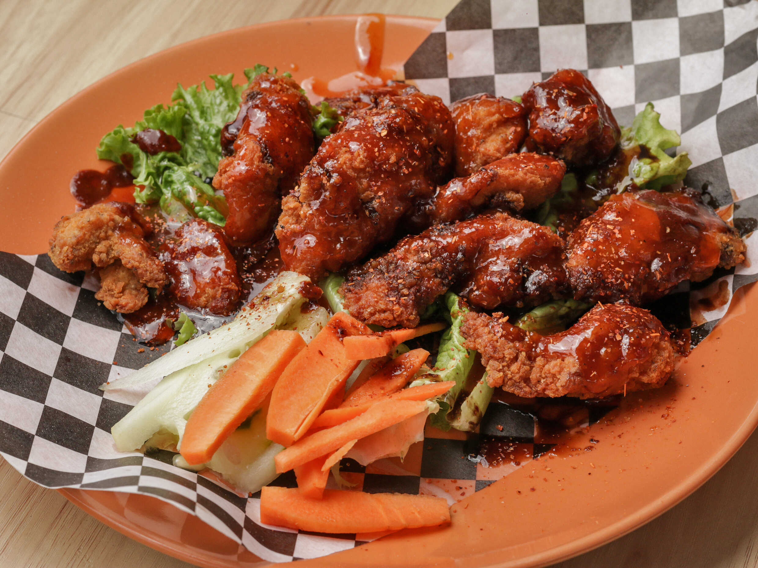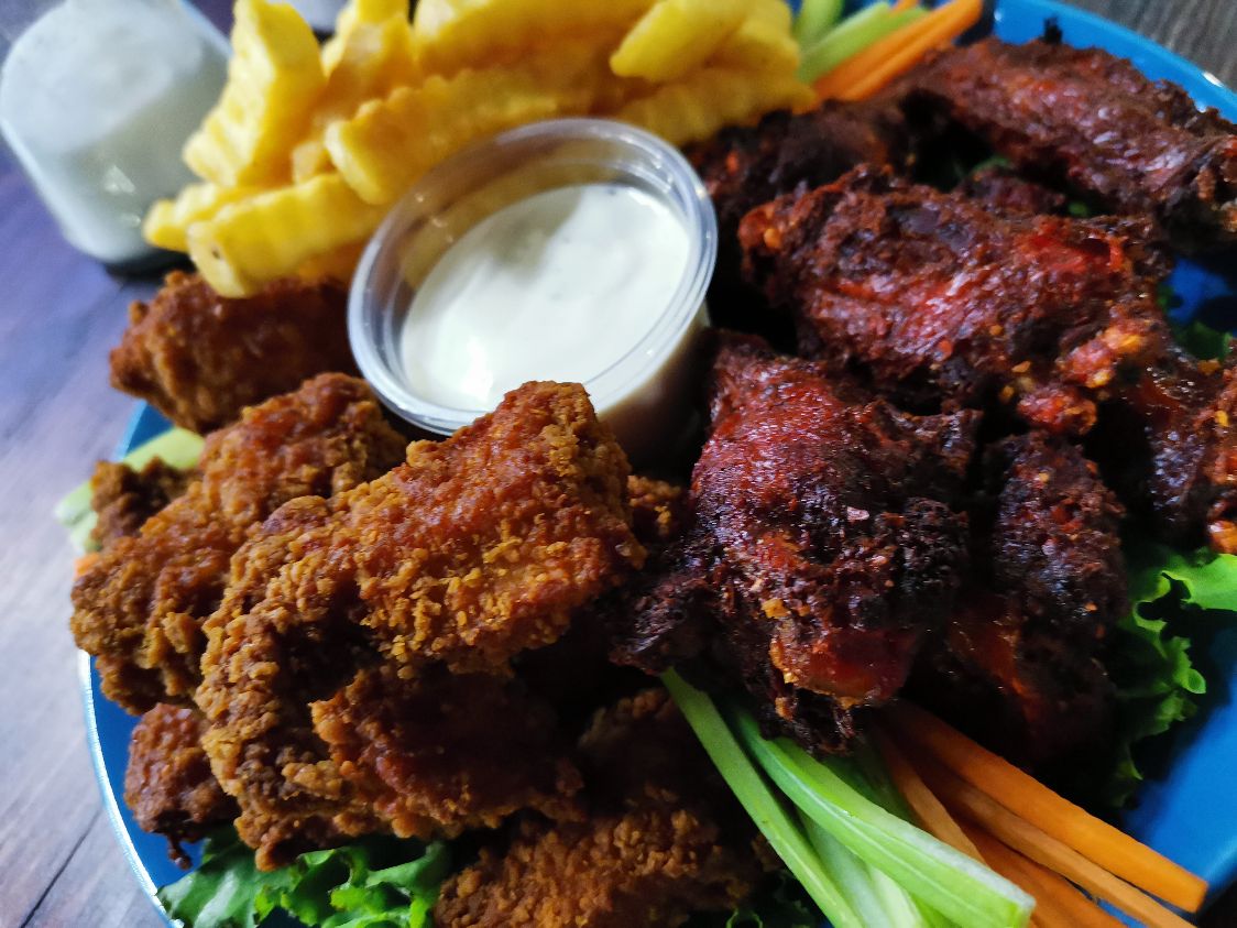 Orden de alitas, boneless y papas a la francesa.