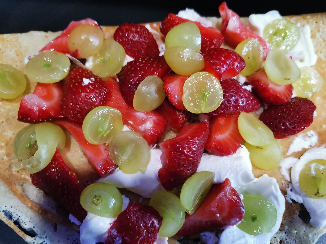 Crepa rellena de philadelphia servida con uvas con crema decoradas con crema batida y conejo turín