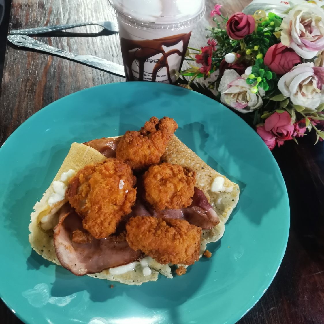 Crepa rellena de duraznos, fresa, philadelphia y chocorrol decorada con crema batida y topping de tu preferencia.