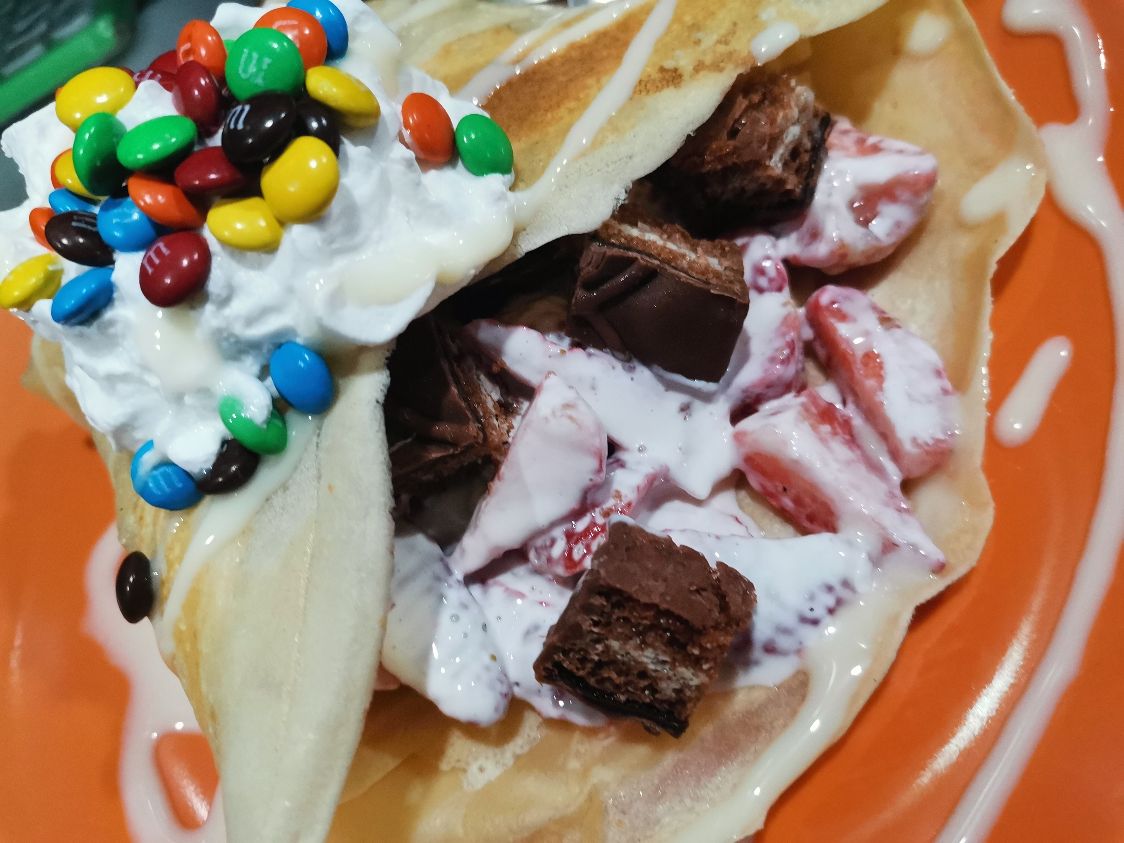 Crepa rellena de fresas con crema, kinder delice, decoradas con crema batida y el topping de tu preferencia.