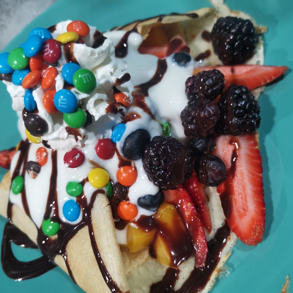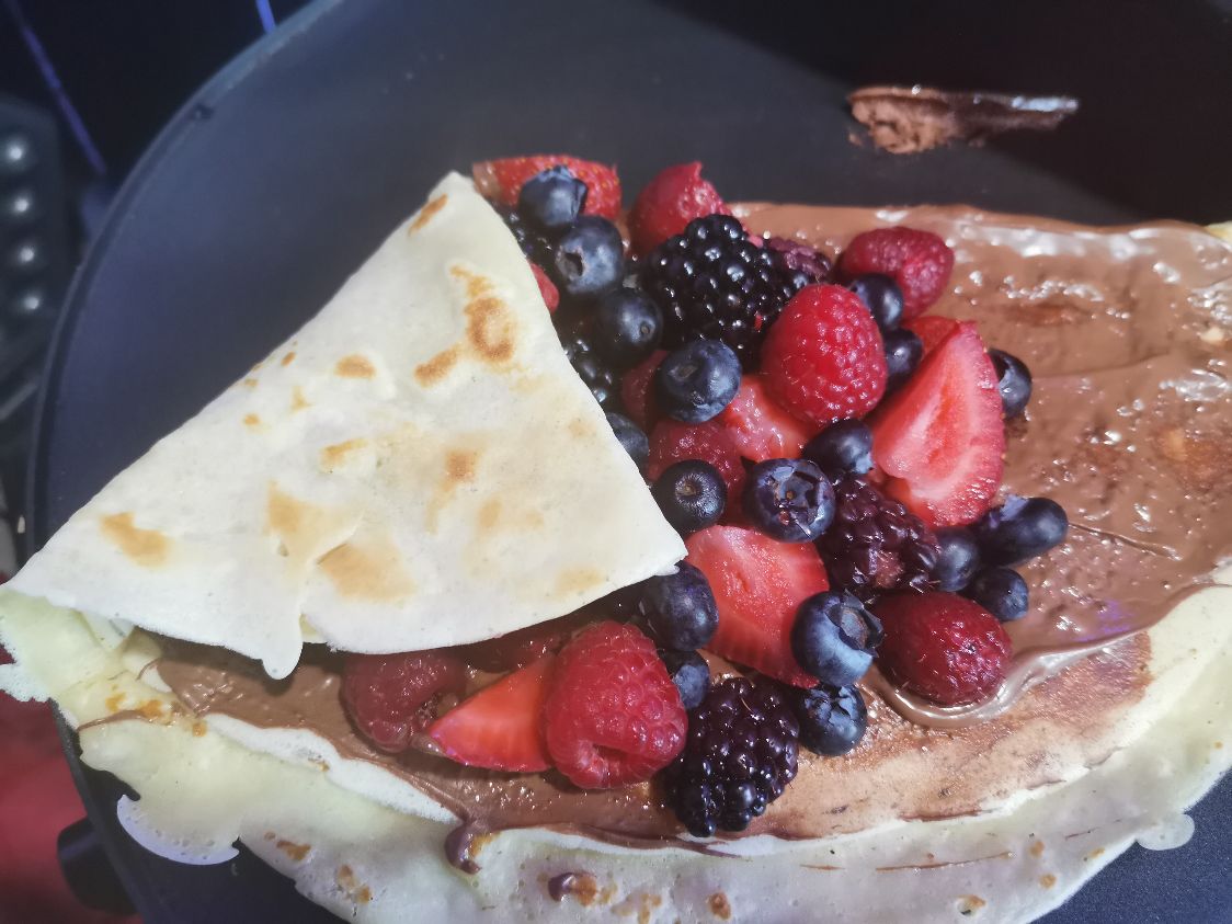 Crepa rellena de nutella, blueberry, zarzamora, frambuesa y fresa decorada con un punto de crema batida y topping de tu preferencia.