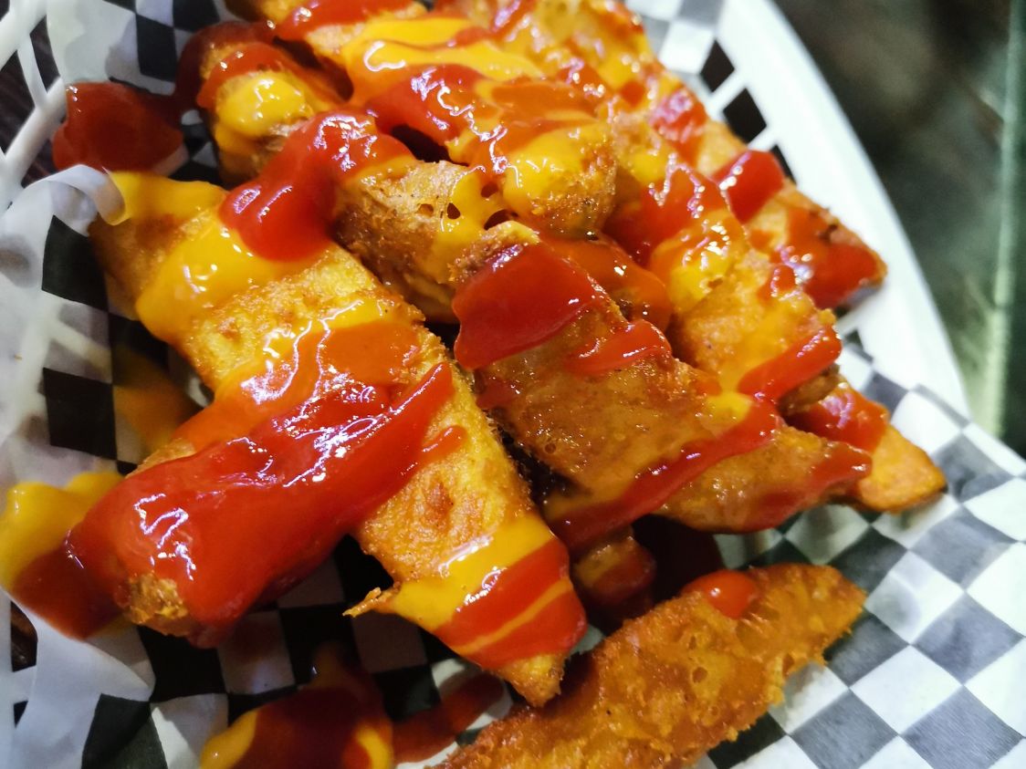 Crepa acompañada de papas a la francesa rellena de salsa de pizza, mozzarella, piña, jamón, tocino o cereza.