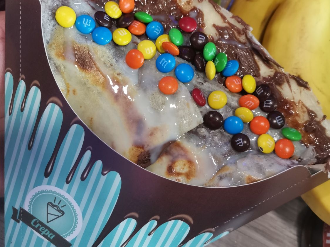 Crepa rellena de Nutella con plátano, nuez decorada con crema batida, corneto y chispas de chocolate.