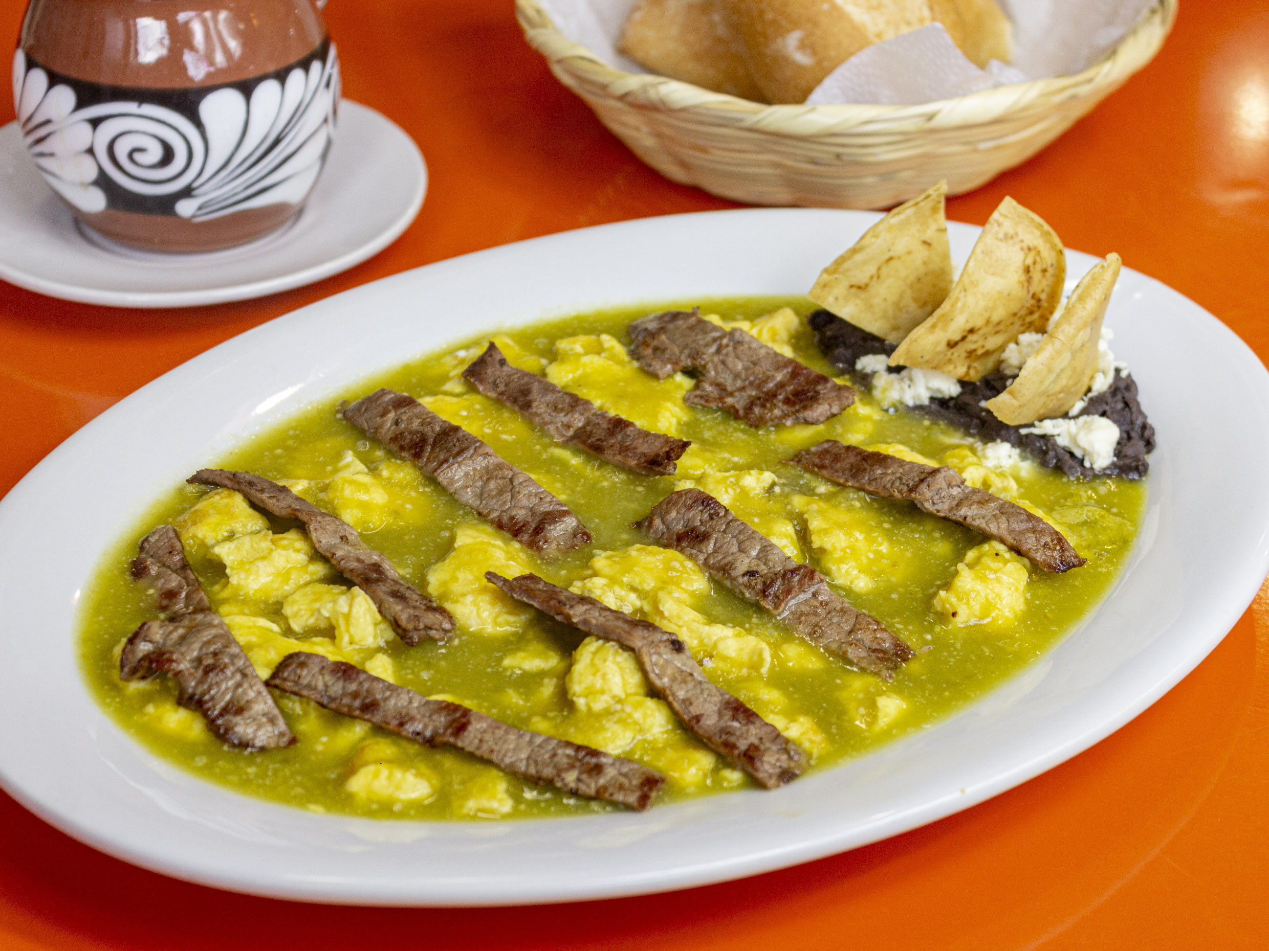 Huevos revueltos bañados en salsa verde con tiras de bistec, acompañados con frijoles refritos. 3pz.