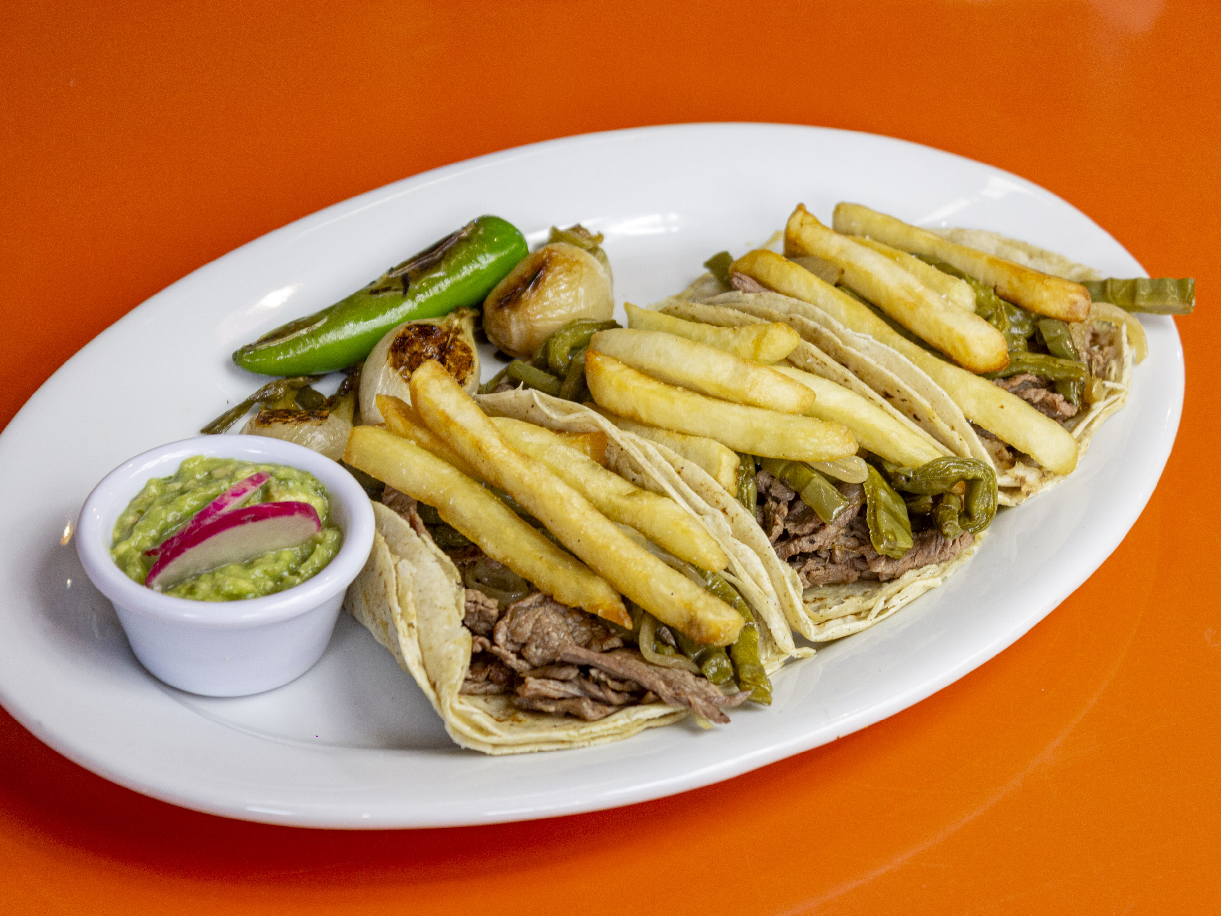 Orden de 3 Tacos, acompañados de papas a la francesa, nopales, cebollas cambray y guacamole.