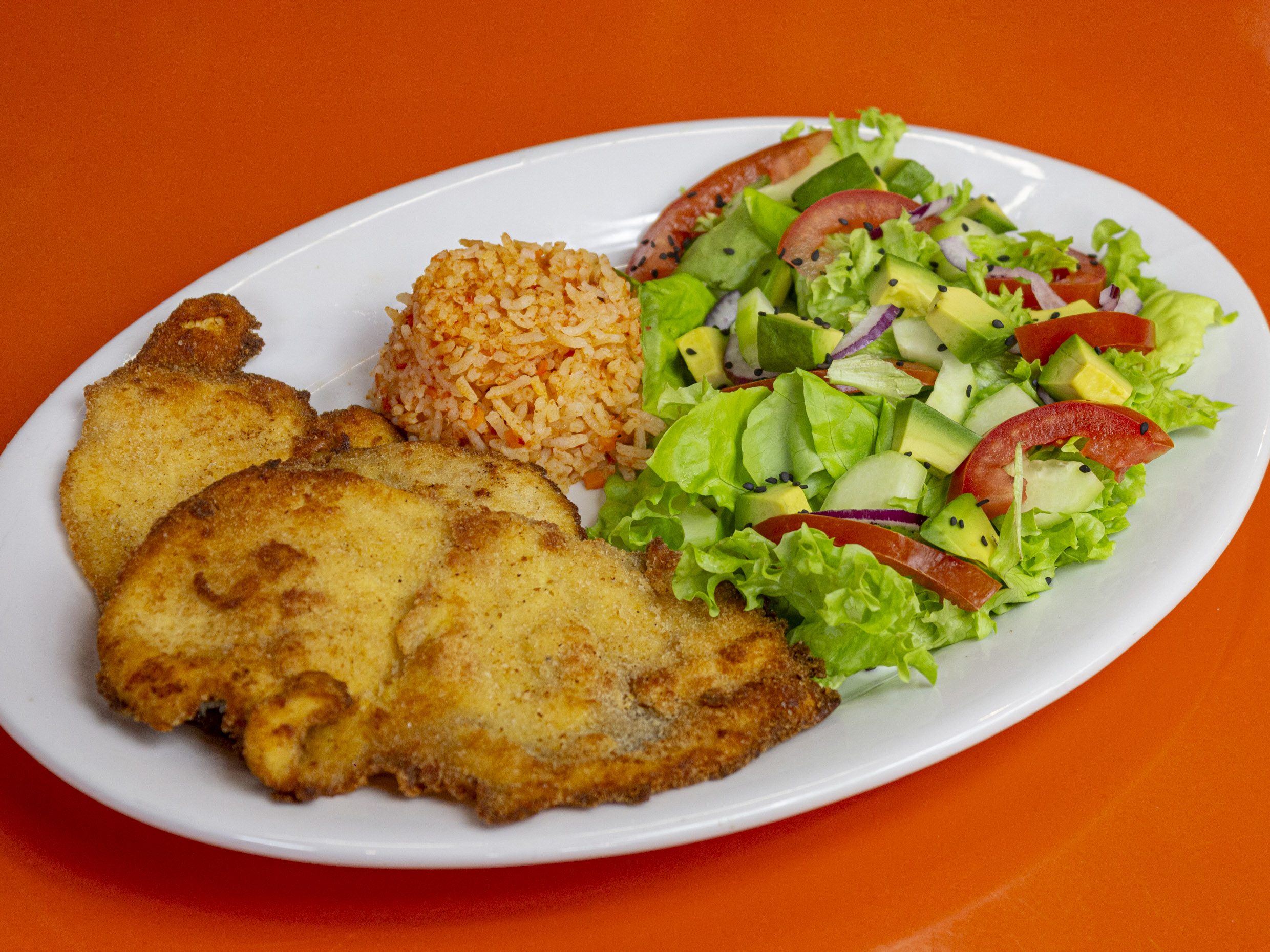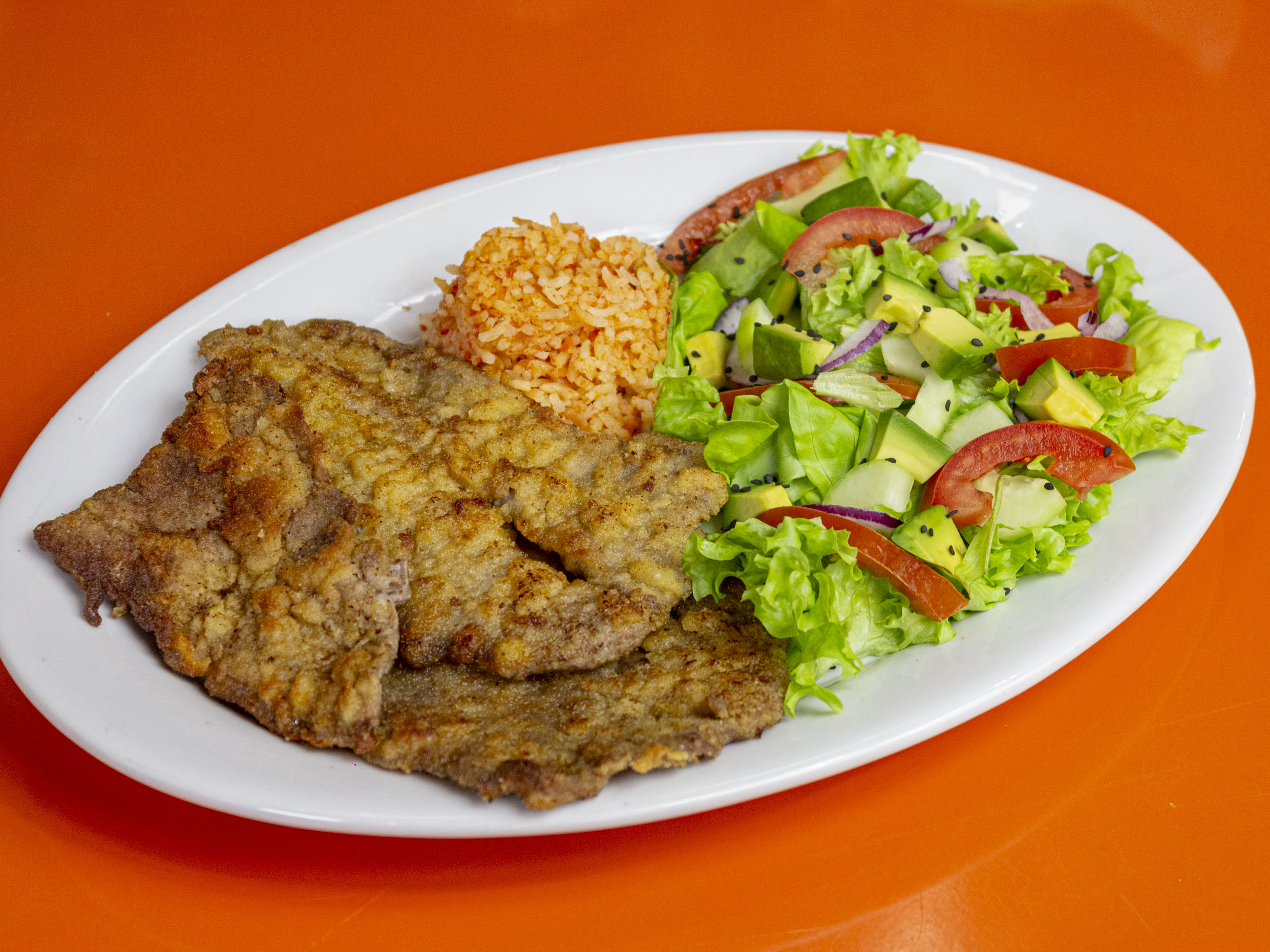 Servida con nuestra rica ensalada; combinación de frescas lechugas, pepino, jitomate, aguacate, cebolla morada y acompañada con arroz.