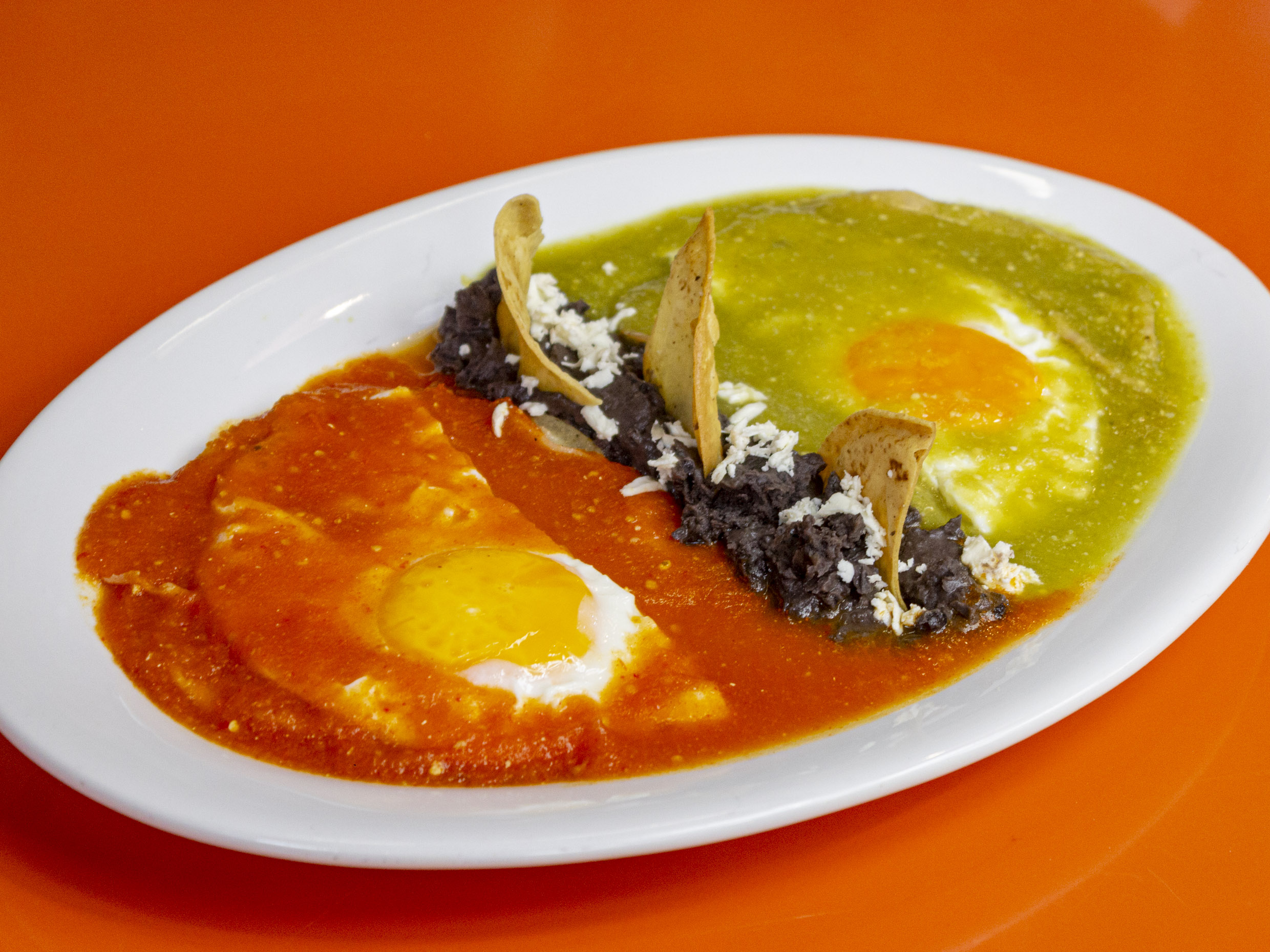 2pz. Huevos estrellados bañados en salsa verde y roja, montados en tortillas ligeramente fritas y una rebanada de jamón entre el huevo y la tortilla.
