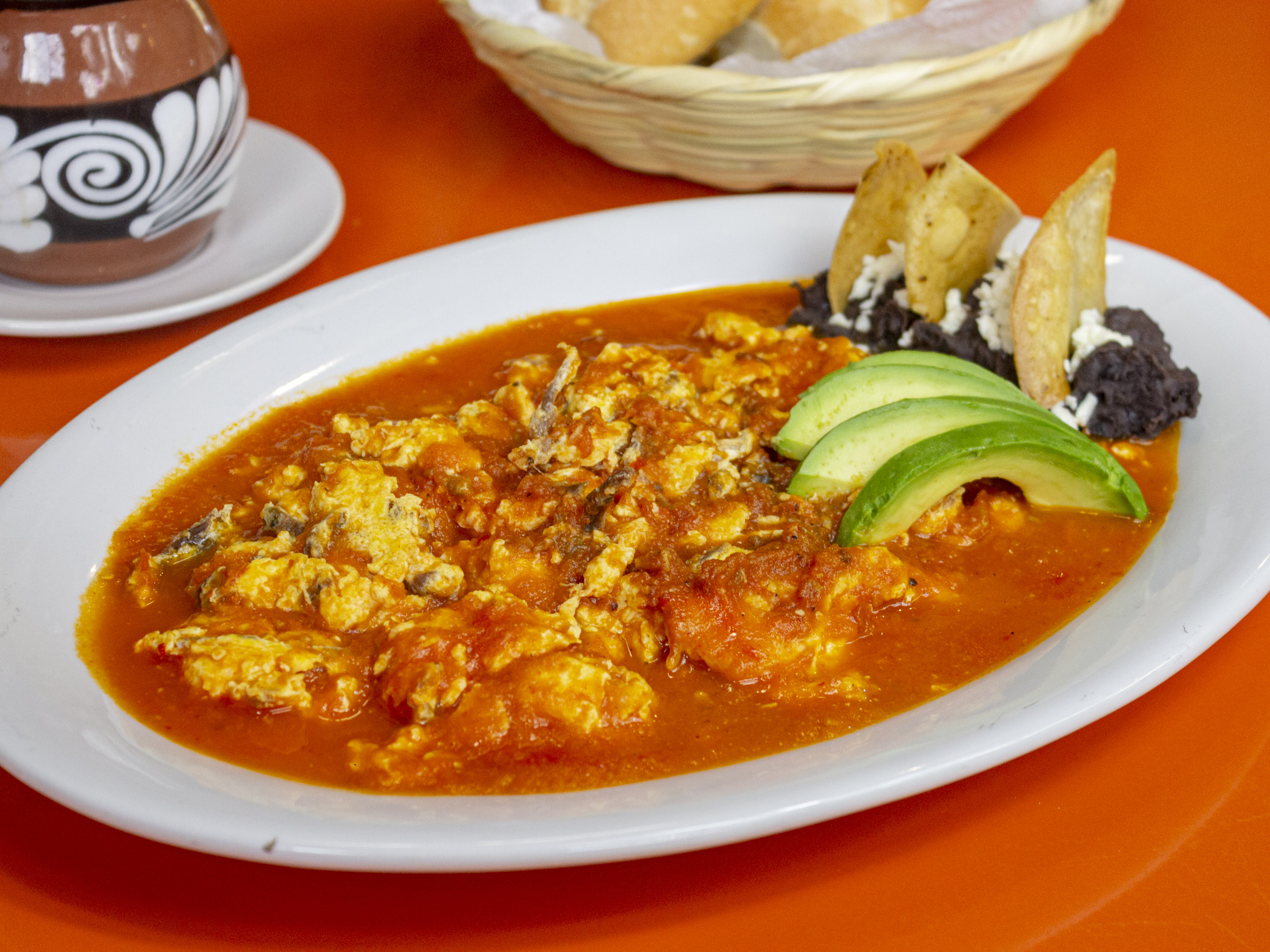 Cecina seca revuelta con huevo, bañada en salsa michoacana, acompañada de frijoles refritos. 3pz.