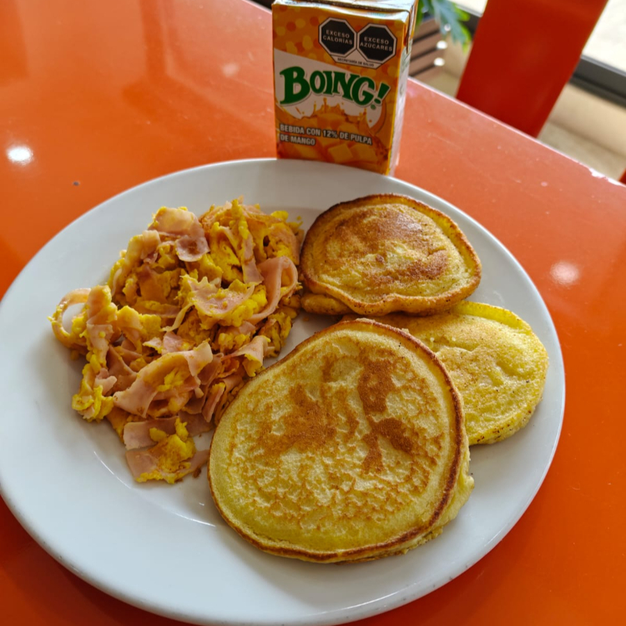 Huevo con chorizo, jamón, tocino, salchicha o a la mexicana, acompañados con frijoles refritos. 3pz.