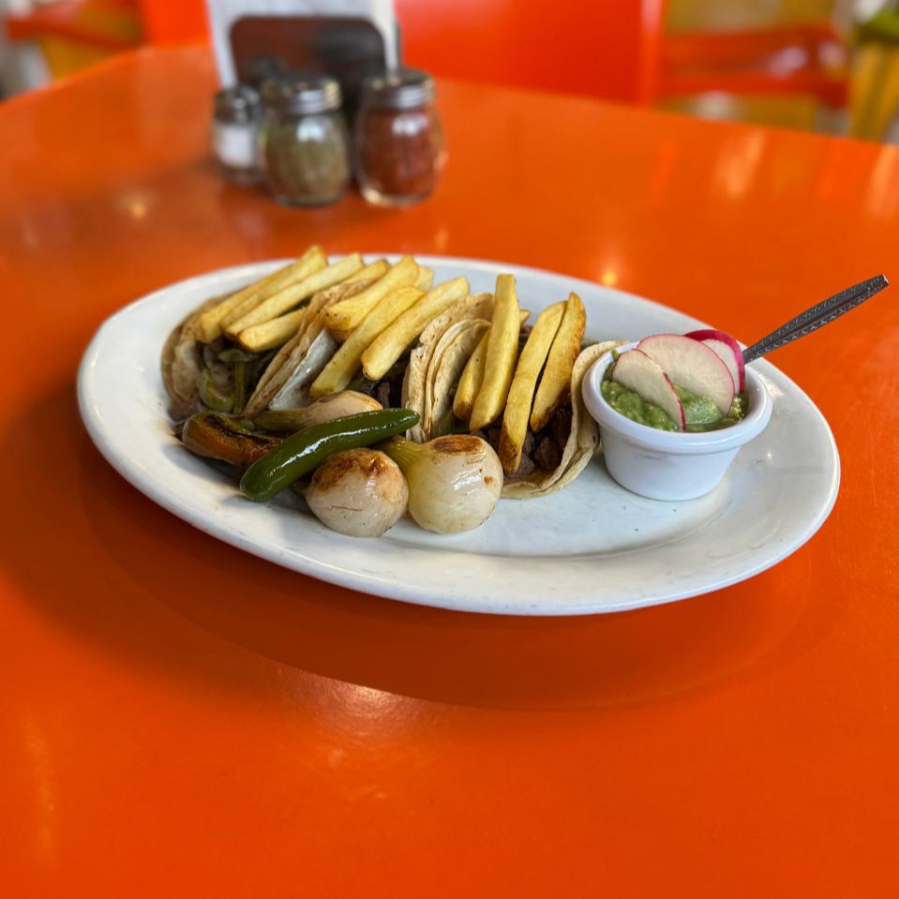 3 Taquitos de bistec o longaniza acompañado de papas a la francesa o ensalada verde, incluye mini jugo y dulce sorpresa.