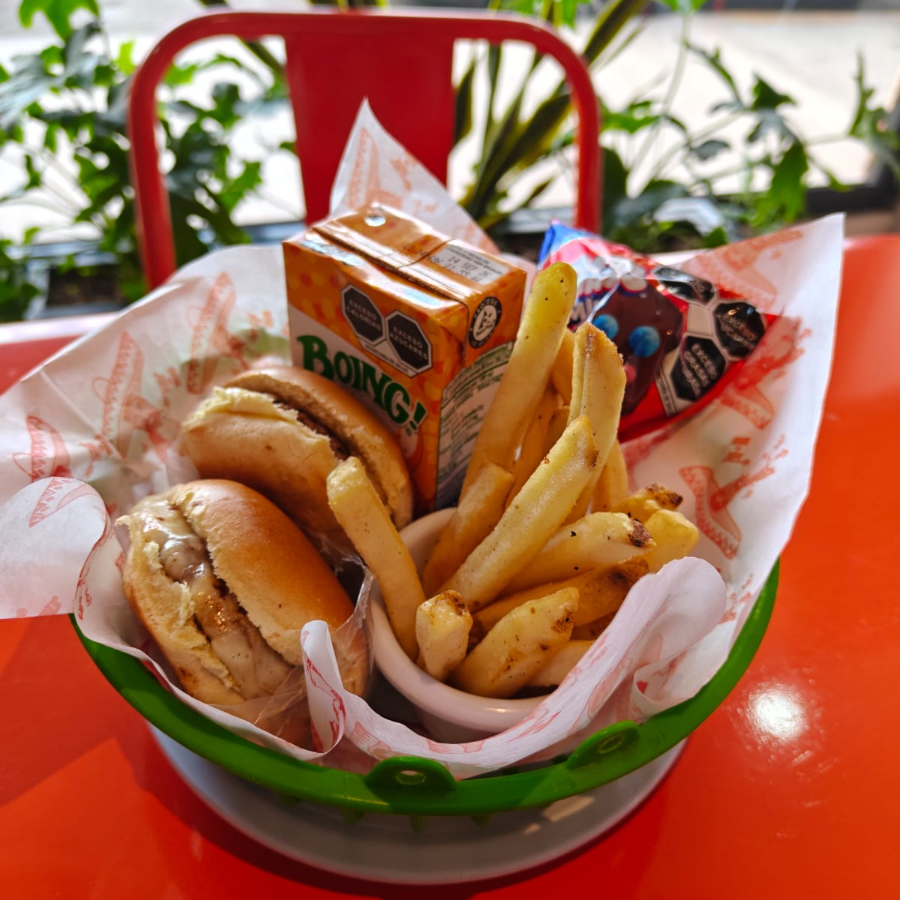 2 Mini pambazos rellenos de bistec o longaniza, acompañado de papas a la francesa o ensalada verde, incluye mini jugo y dulce sorpresa.
