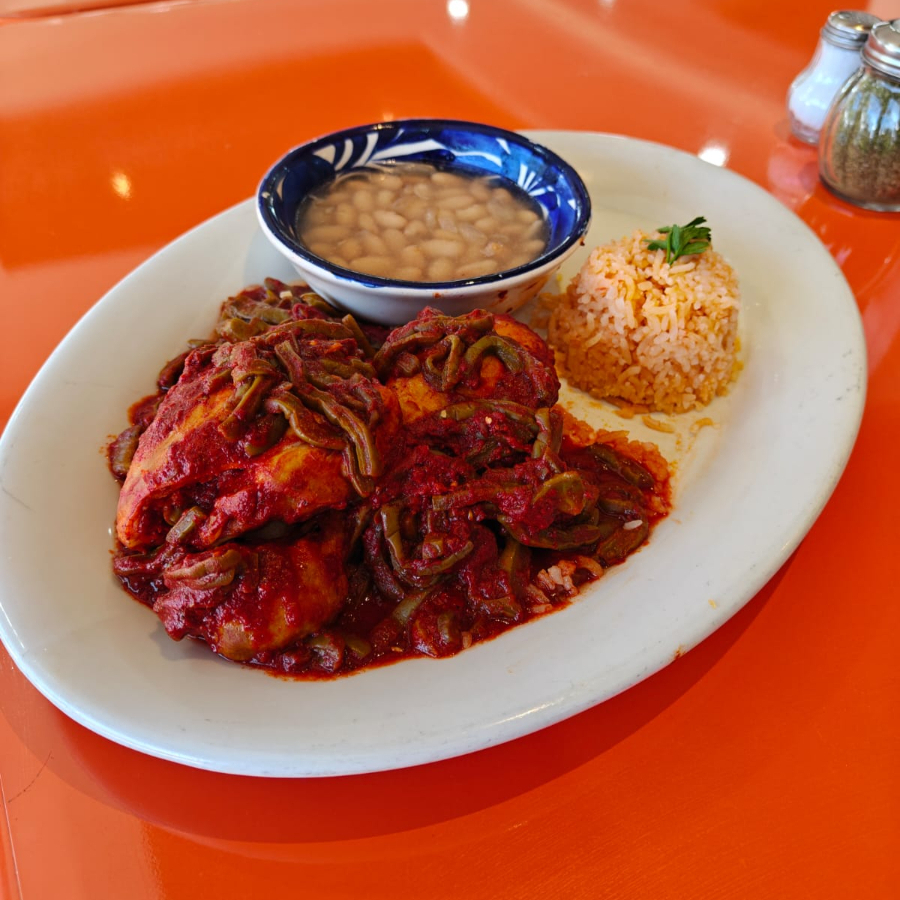 Jugoso corte de res, acompañado de nopal. longaniza, queso panela, cebolla, chiles toreados, y dos deliciosas dobladitas de mole.