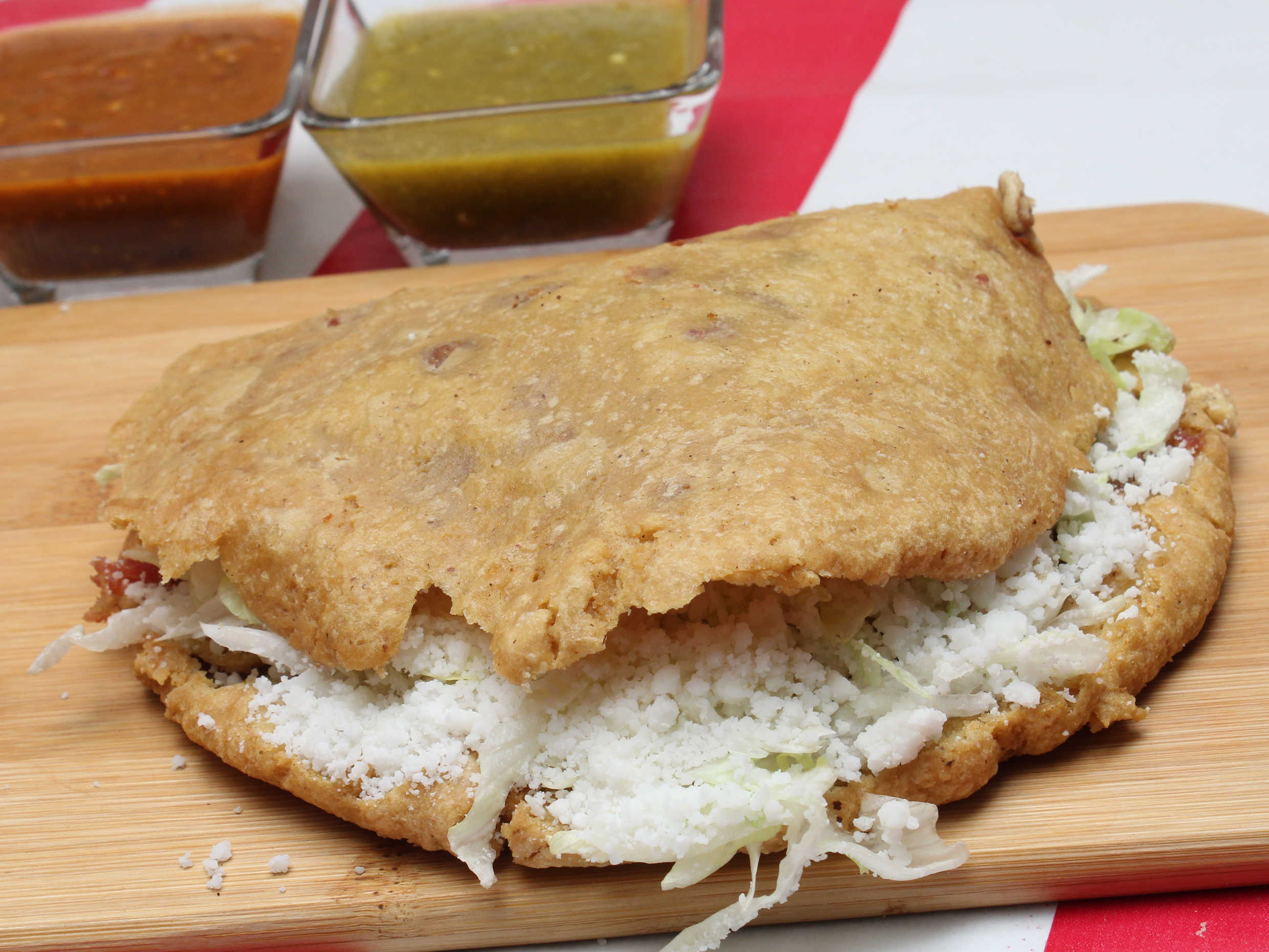 Masa 100% natural de maíz rellena de frijol, queso Oaxaca, lechuga y queso rayado.