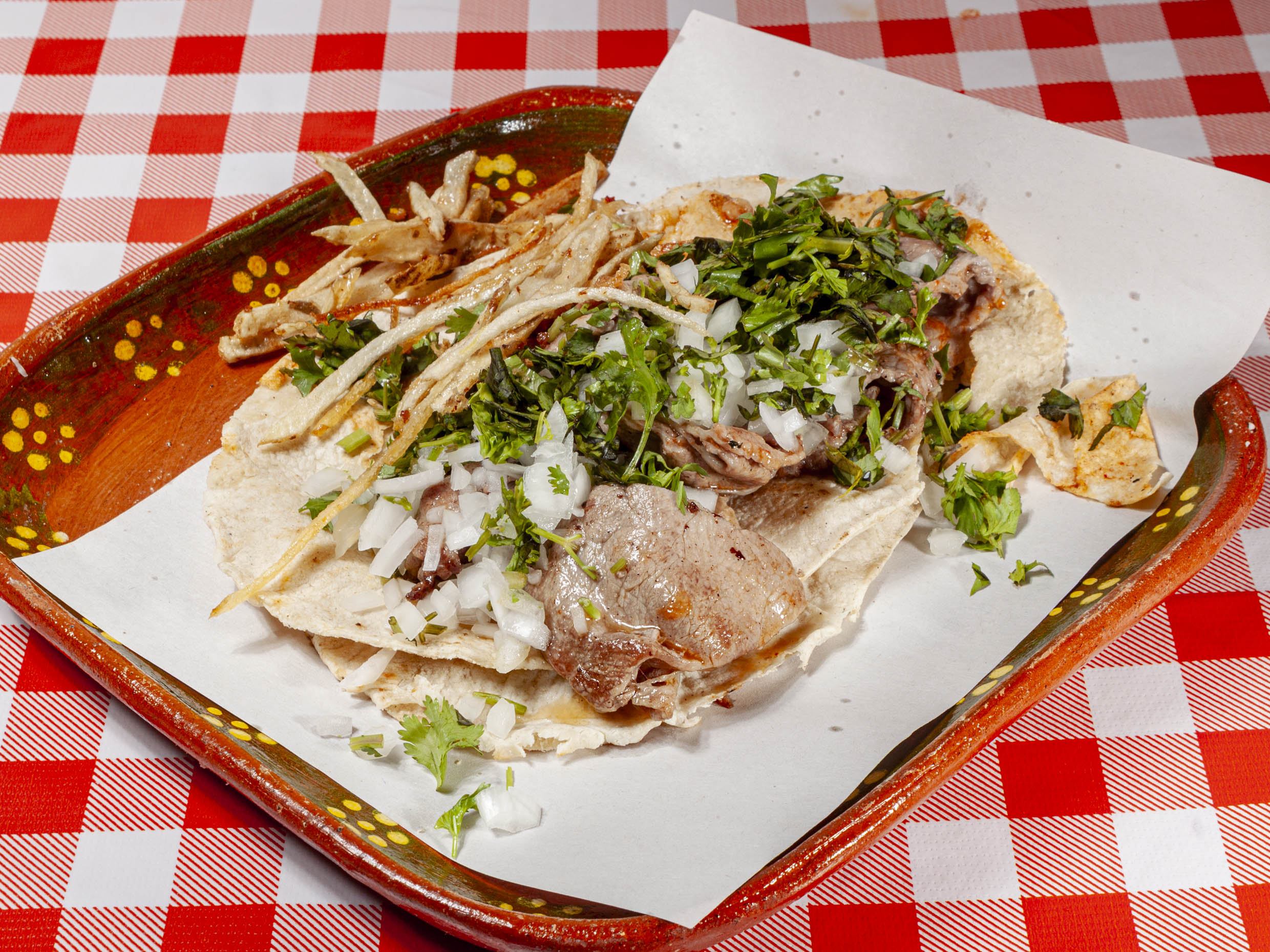 Masa de maíz 100% natural, bistec de res tierno, cebolla y crujiente lechuga. 350 gr