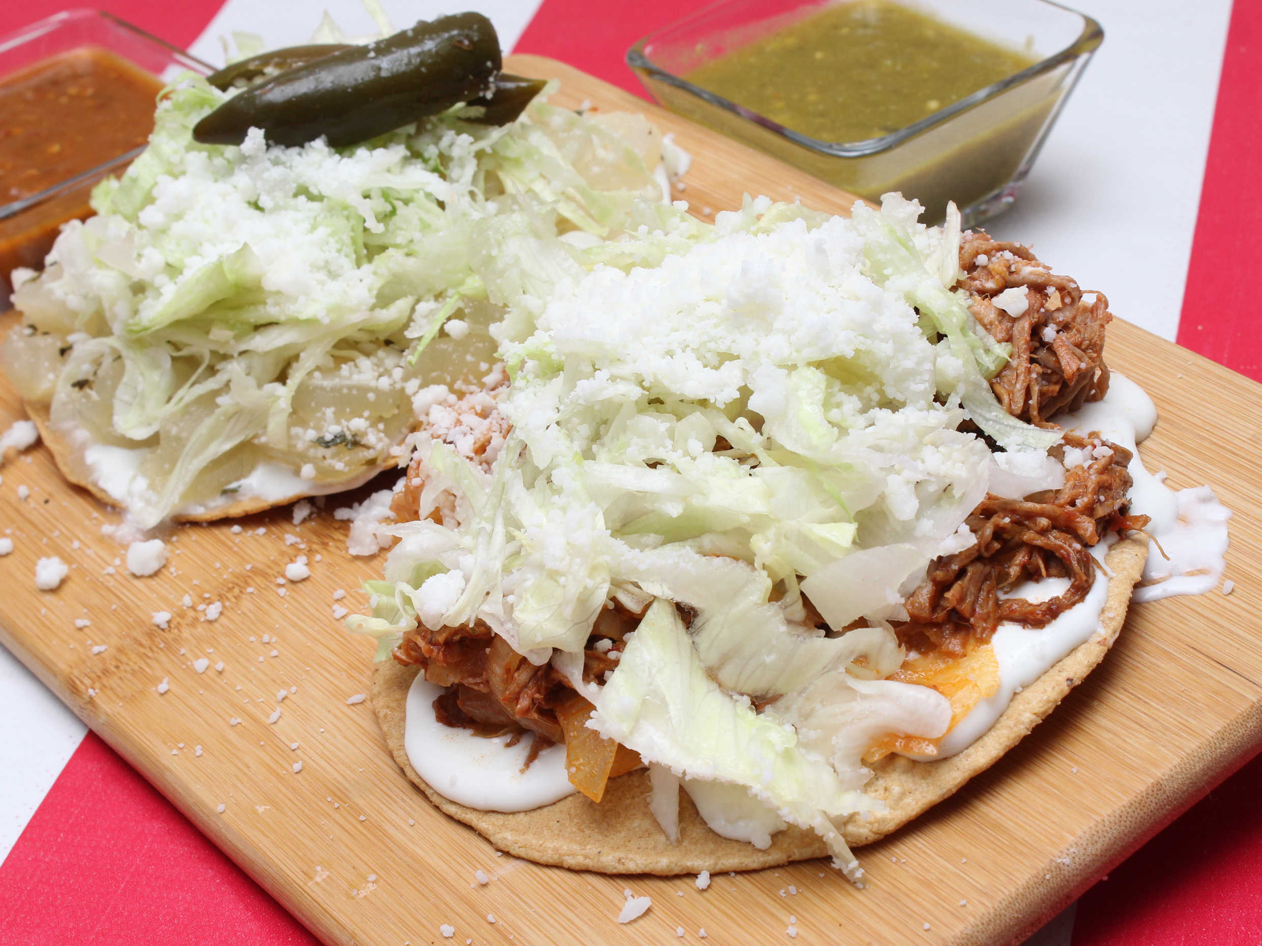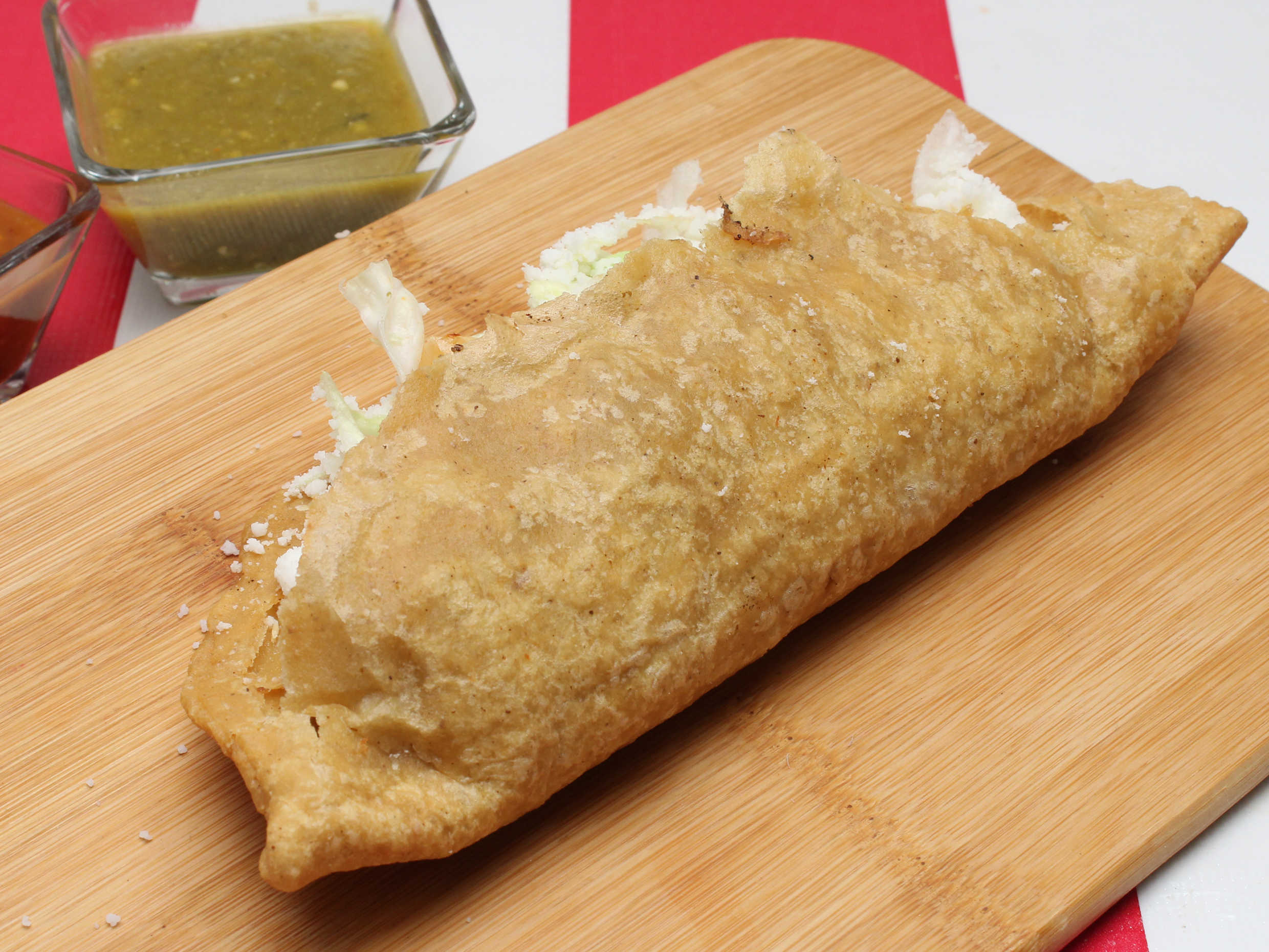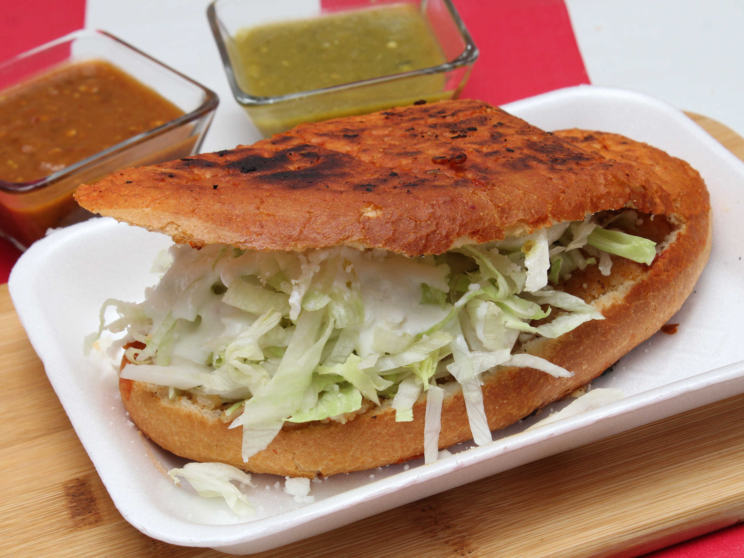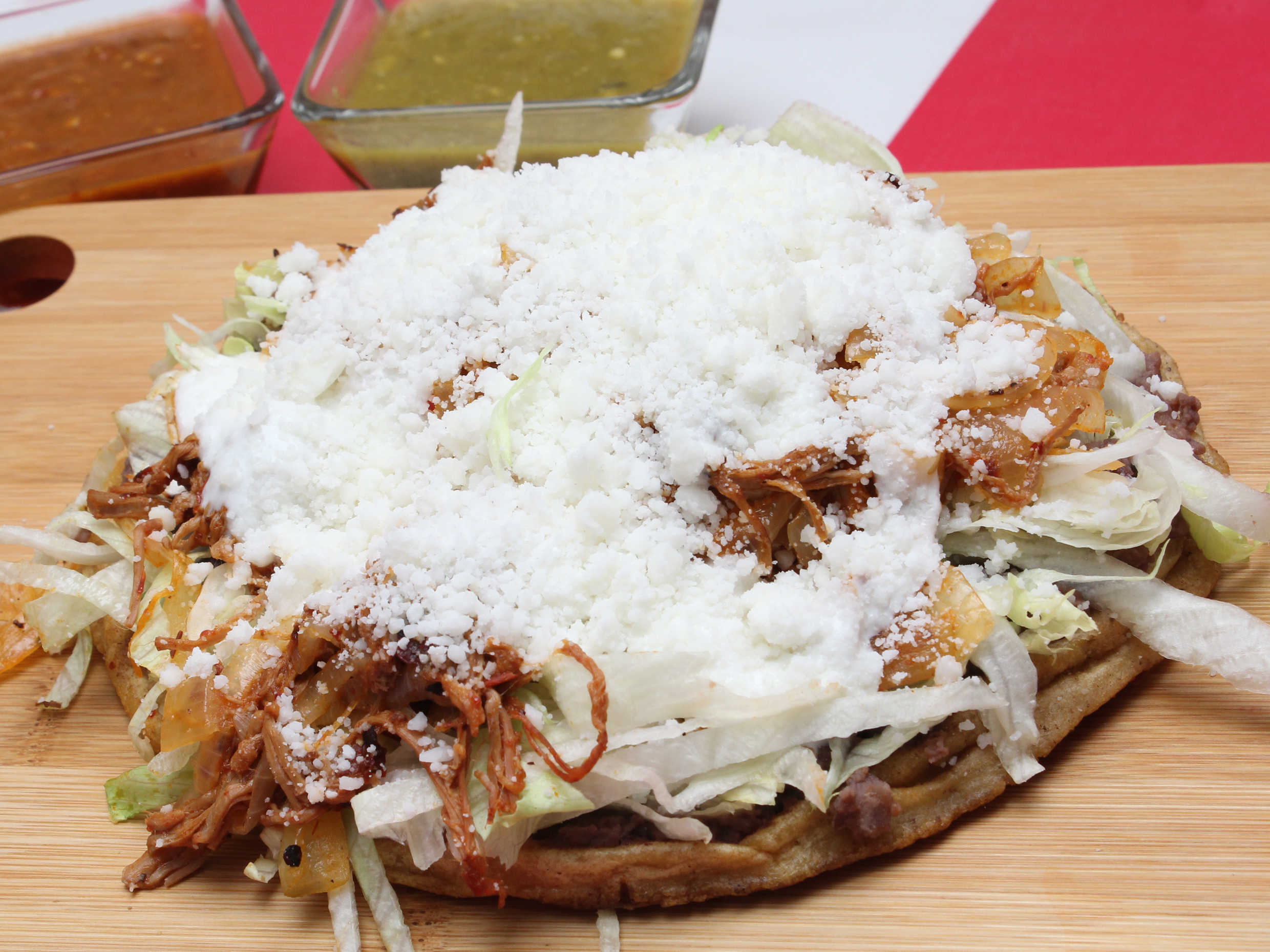 Bollo empapado en salsa de chile guajillo, relleno de papa y chorizo, con lechuga fresca, queso rallado y crema.