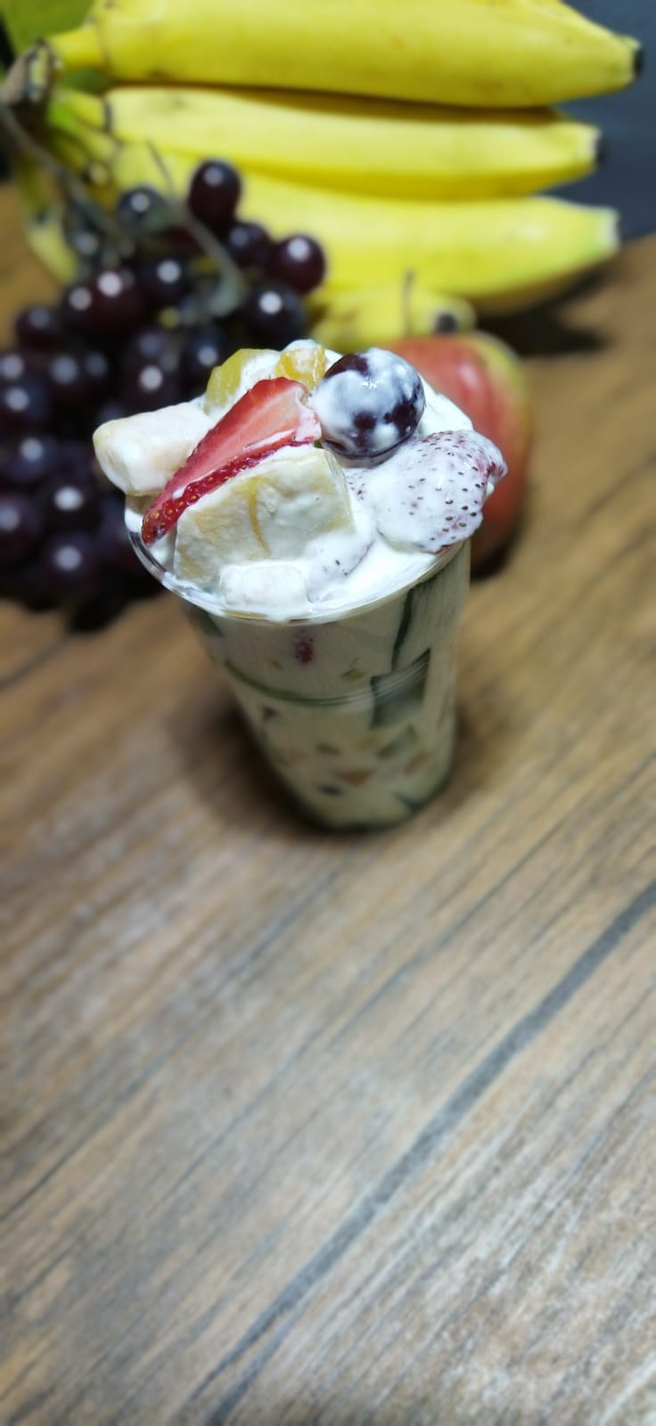 Pequeños trozos de fruta natural, base de crema y gelatina de sabores. 12 oz