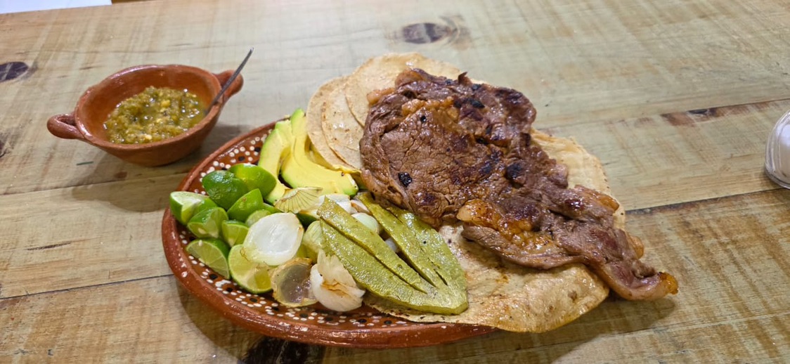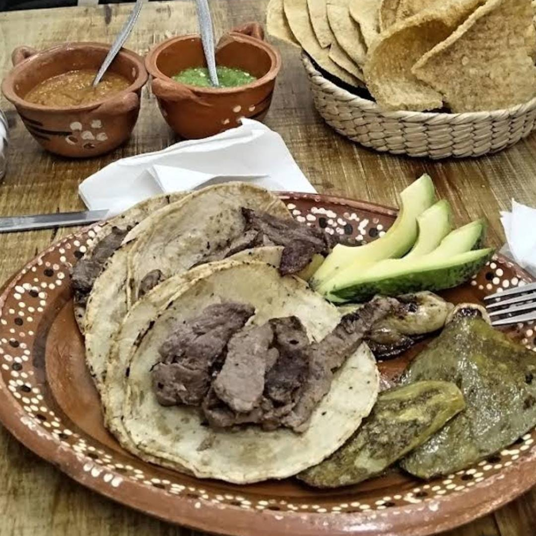 Taco de bistec con 250 g de bistec, acompañado de 3 tortillas, cebolla, nopal y aguacate.
