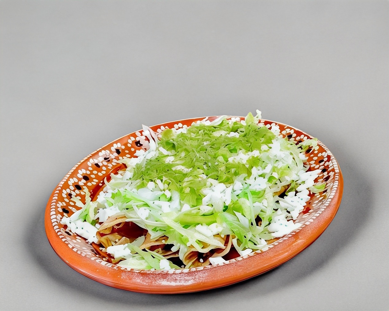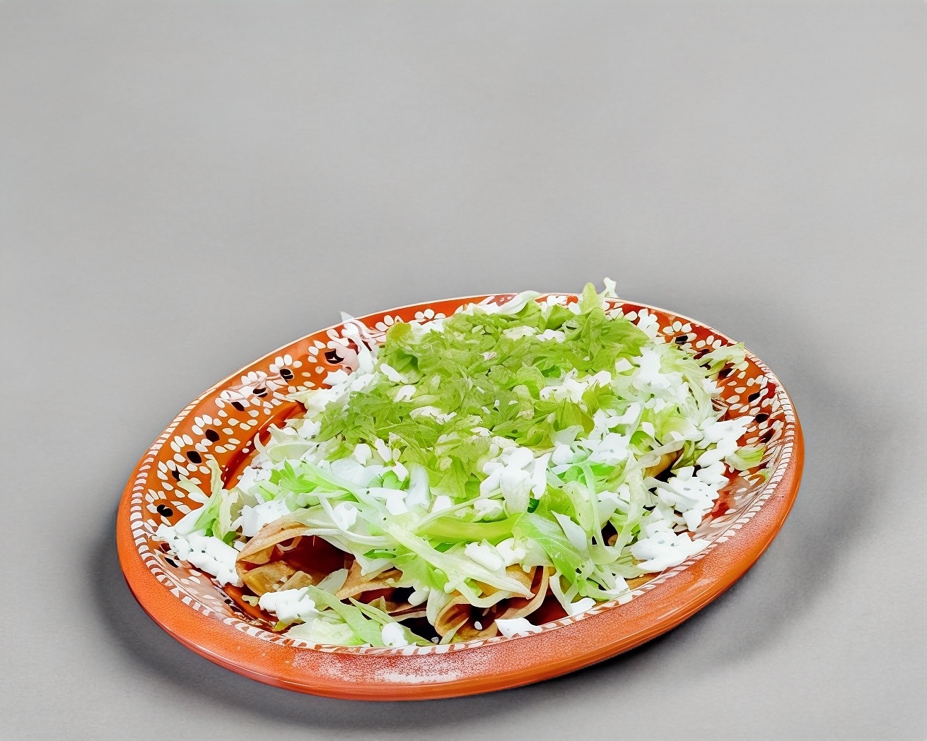 3 flautas de pollo con lechuga, crema, queso y salsa verde.