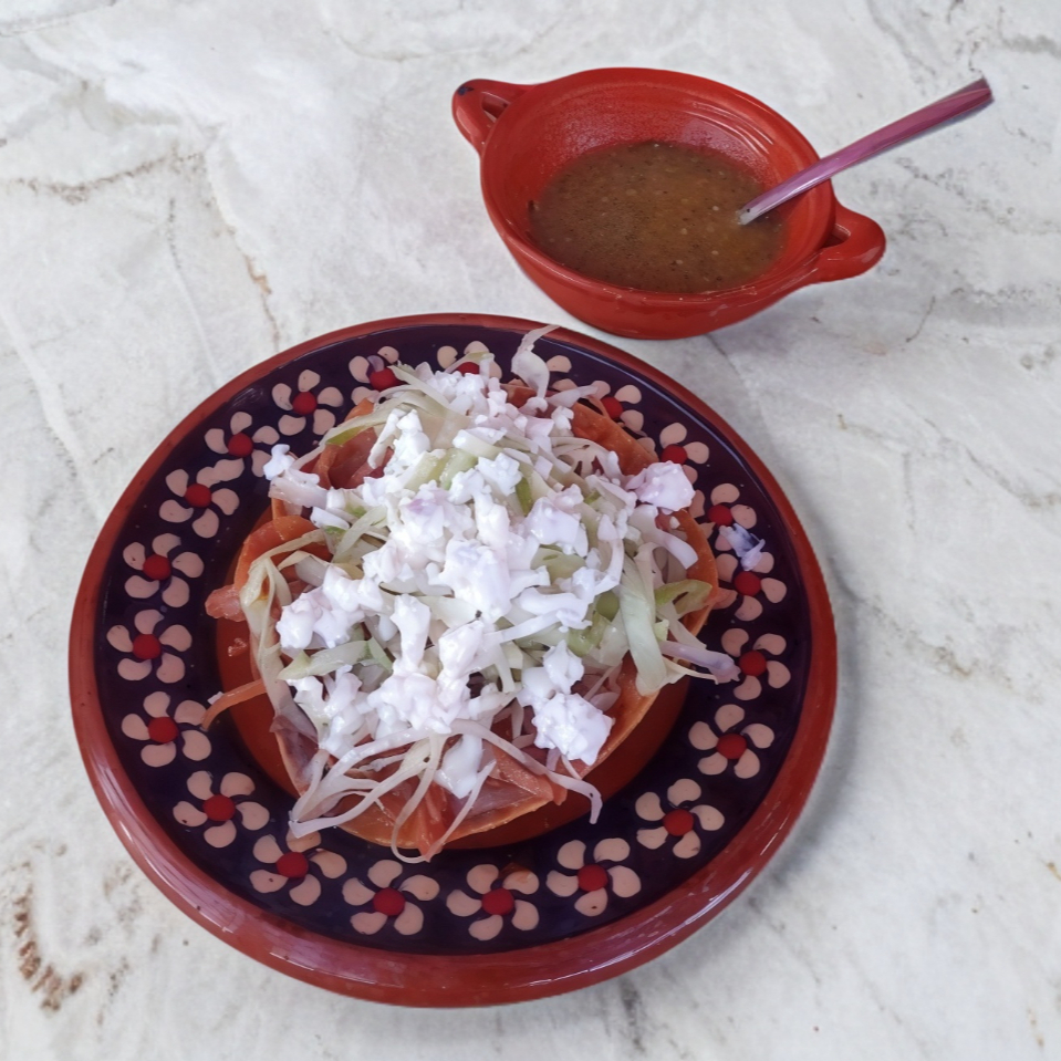 Deliciosa cochinita pibil jugosa y llena de sabor, servida sobre un panucho crujiente con frijoles refritos y cebolla encurtida. Un clásico y auténtico bocado yucateco.