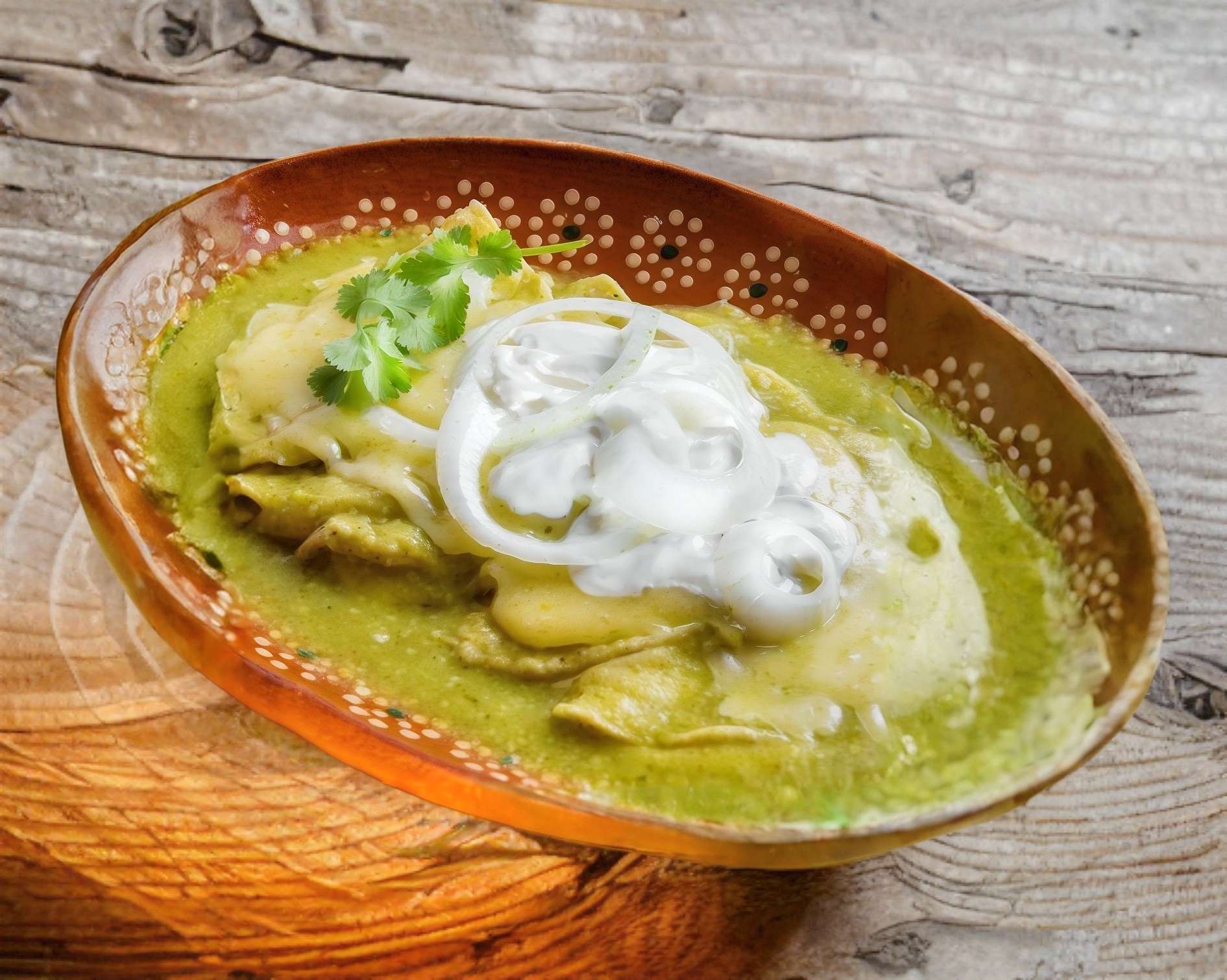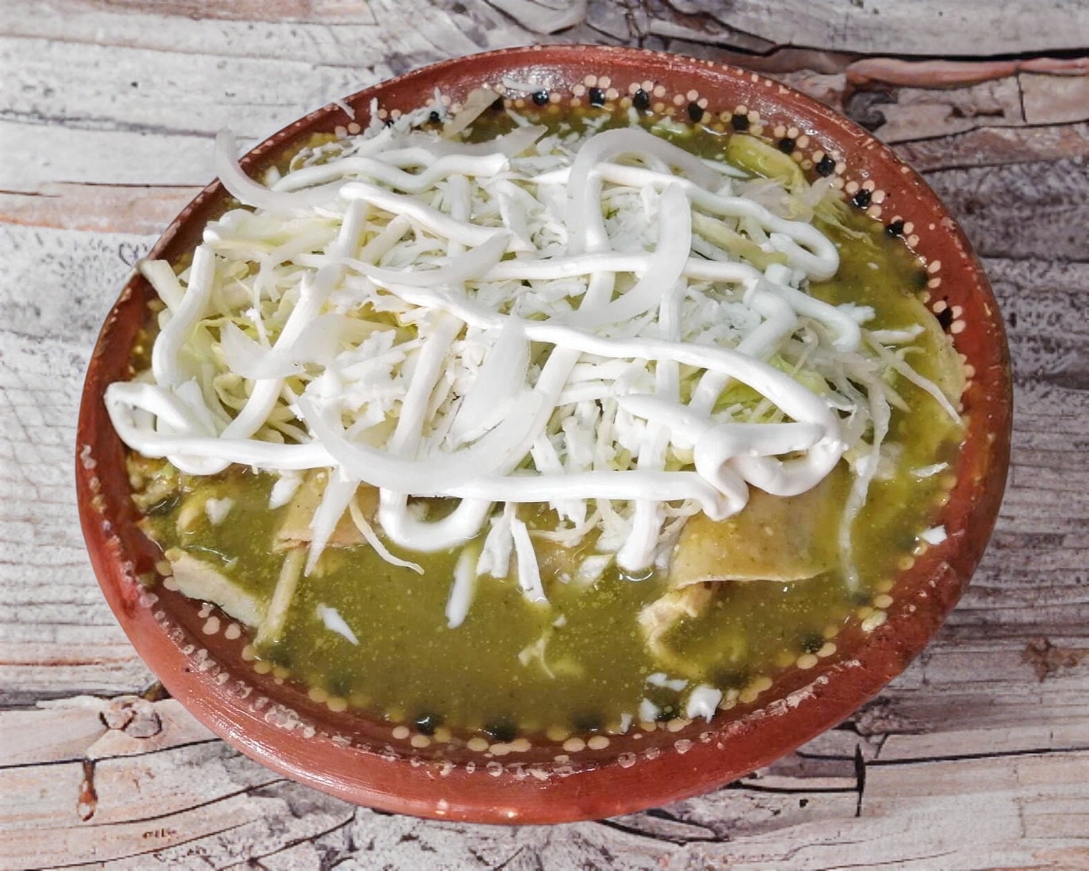 4 enchiladas verdes, con pechuga de pollo, crema, queso y cebolla