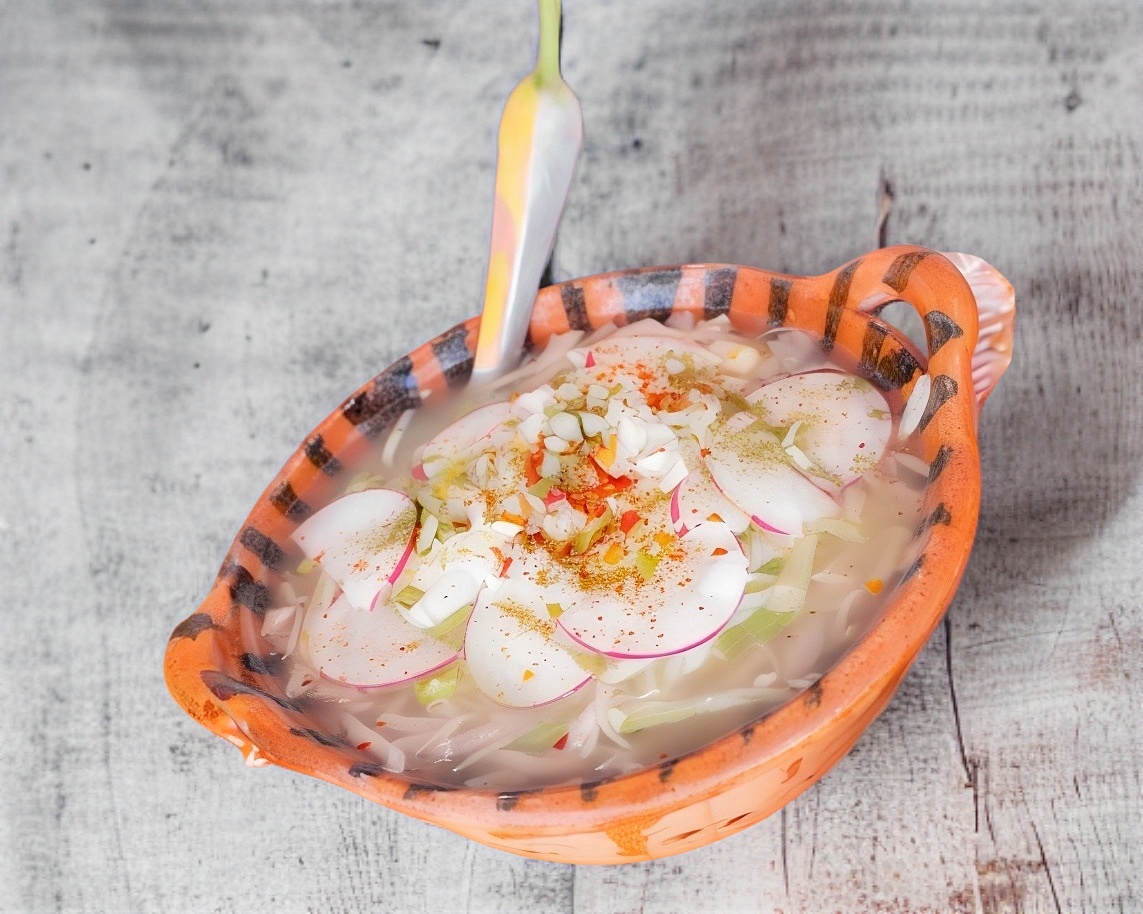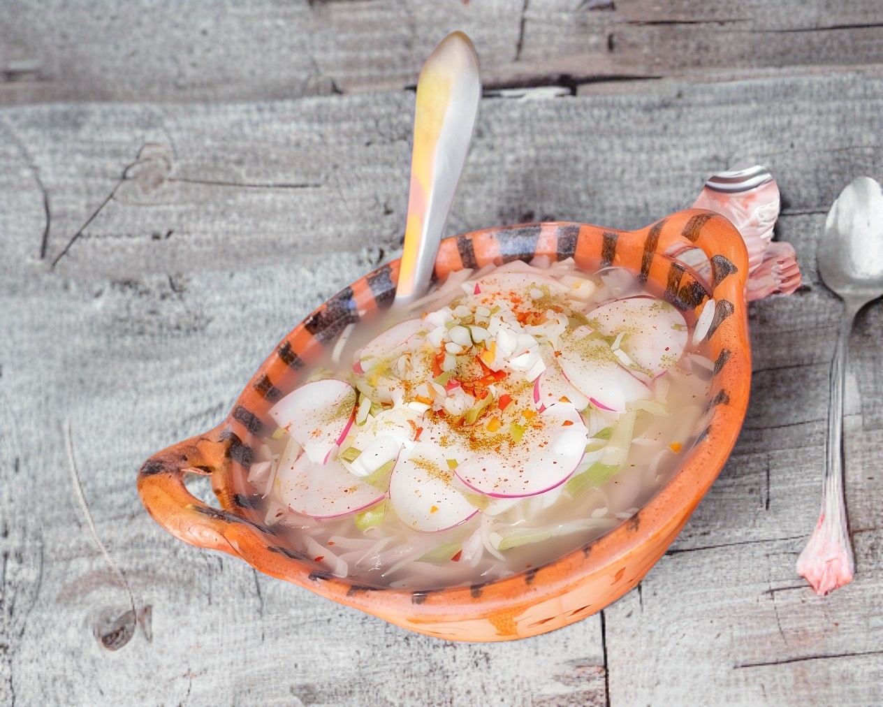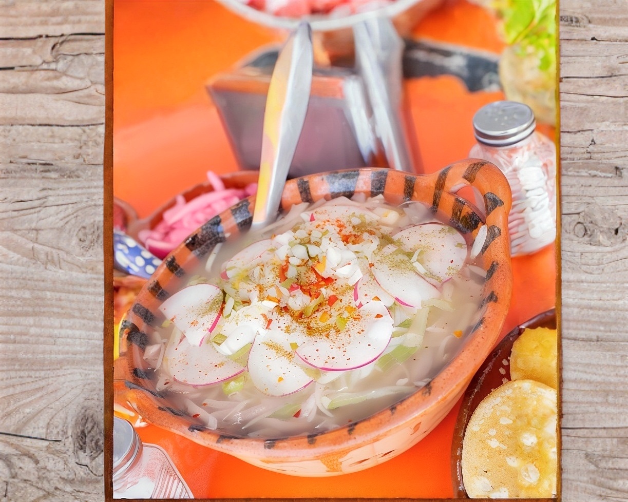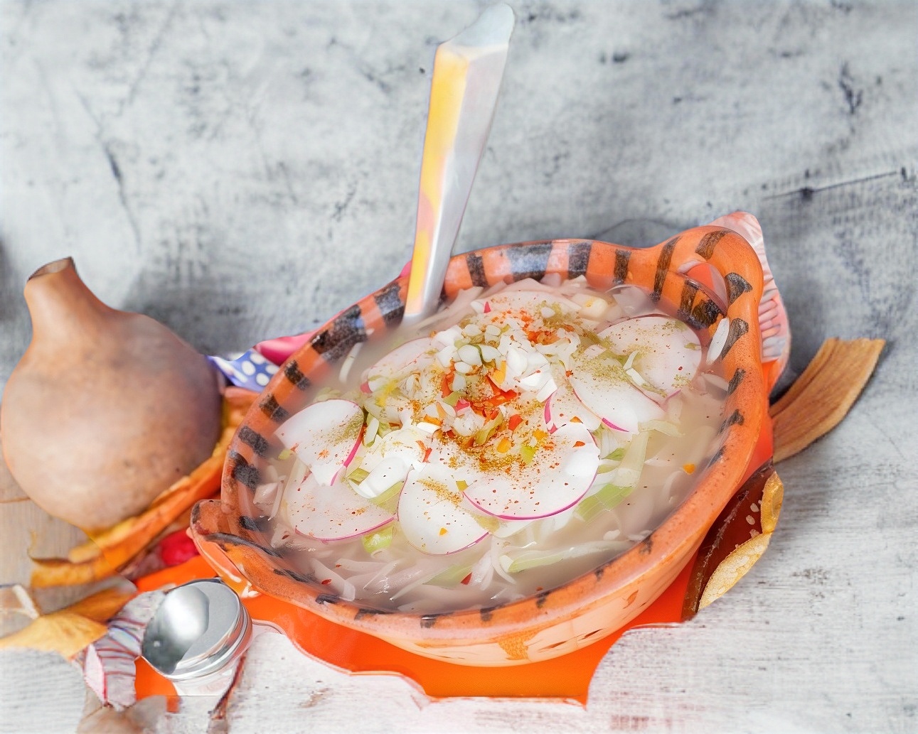 Exquisito pozole blanco en porción súper de 2 litros, preparado con carne de pollo suave y jugosa. Se acompaña con rábanos frescos, lechuga crujiente, cebolla picada, chile en polvo y tostadas doradas. Un platillo tradicional mexicano en tamaño ideal para compartir y disfrutar al máximo