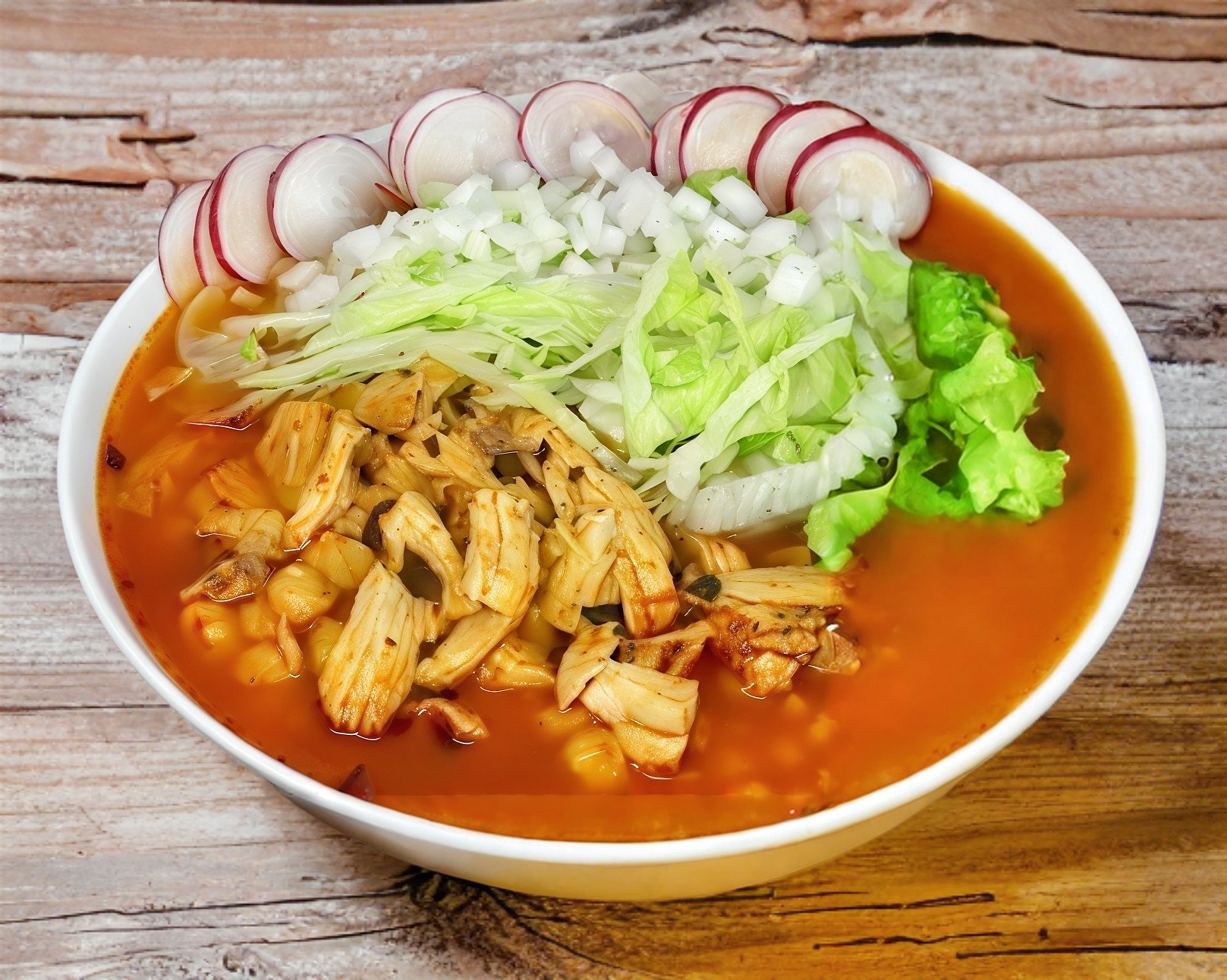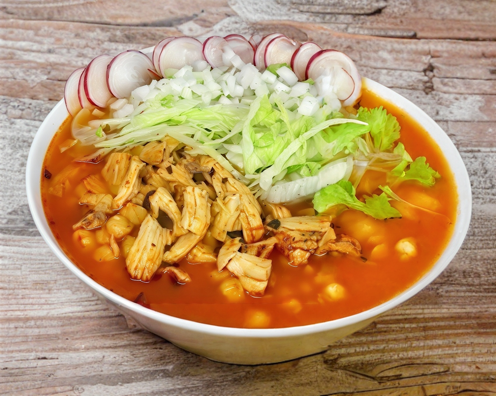 Delicioso pozole rojo tradicional con surtida de carne, servido en porción mediana de 600 ml. Acompañado con rábanos, lechuga, cebolla, orégano, chile en polvo y tostadas para disfrutar al máximo.