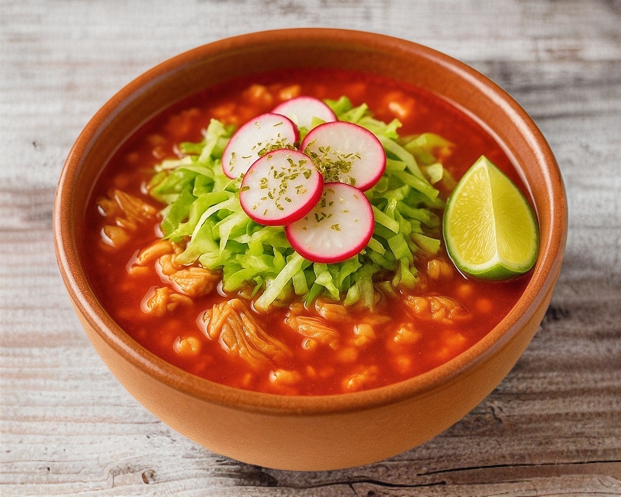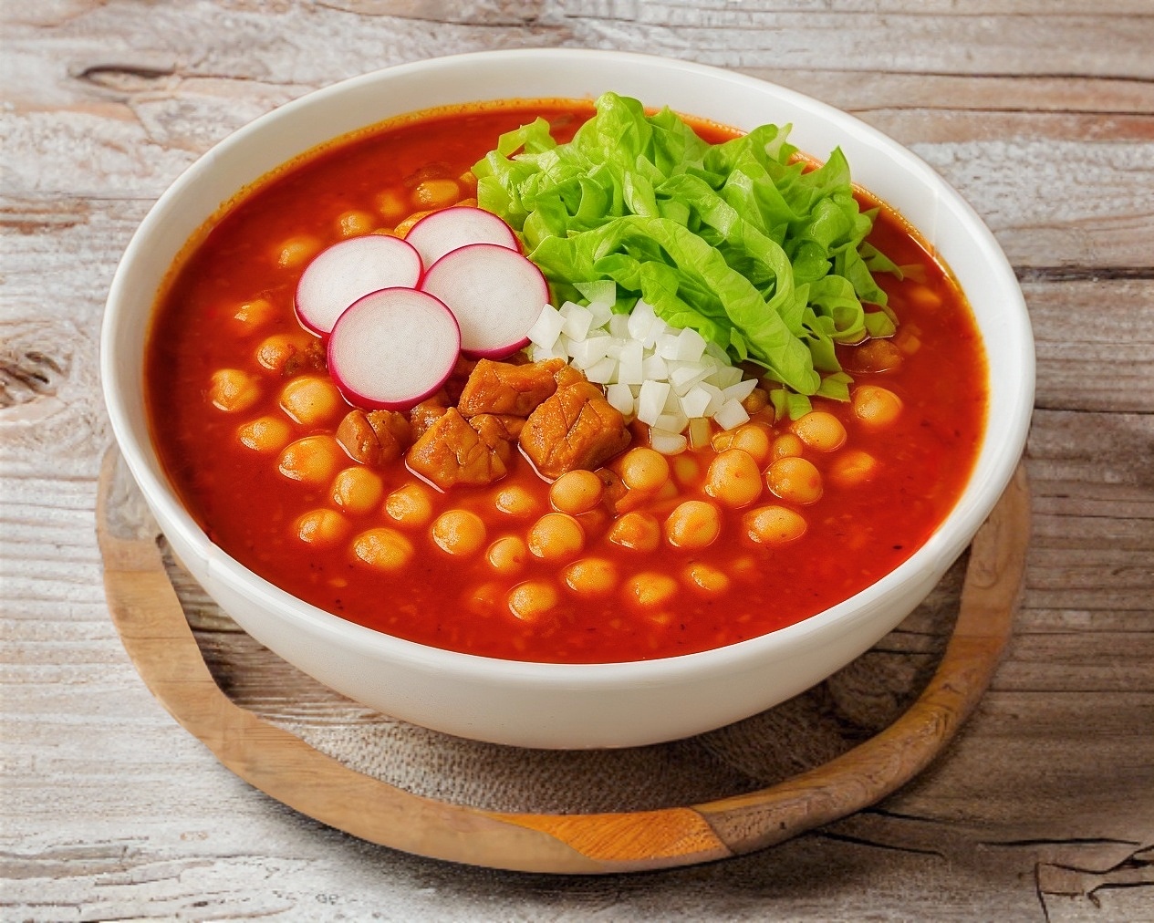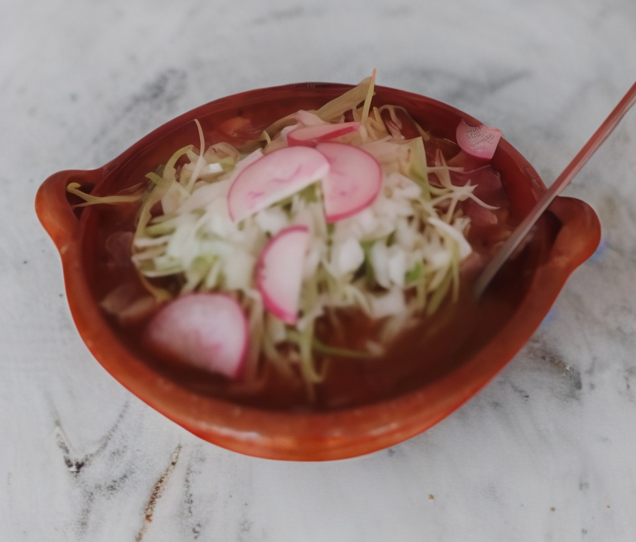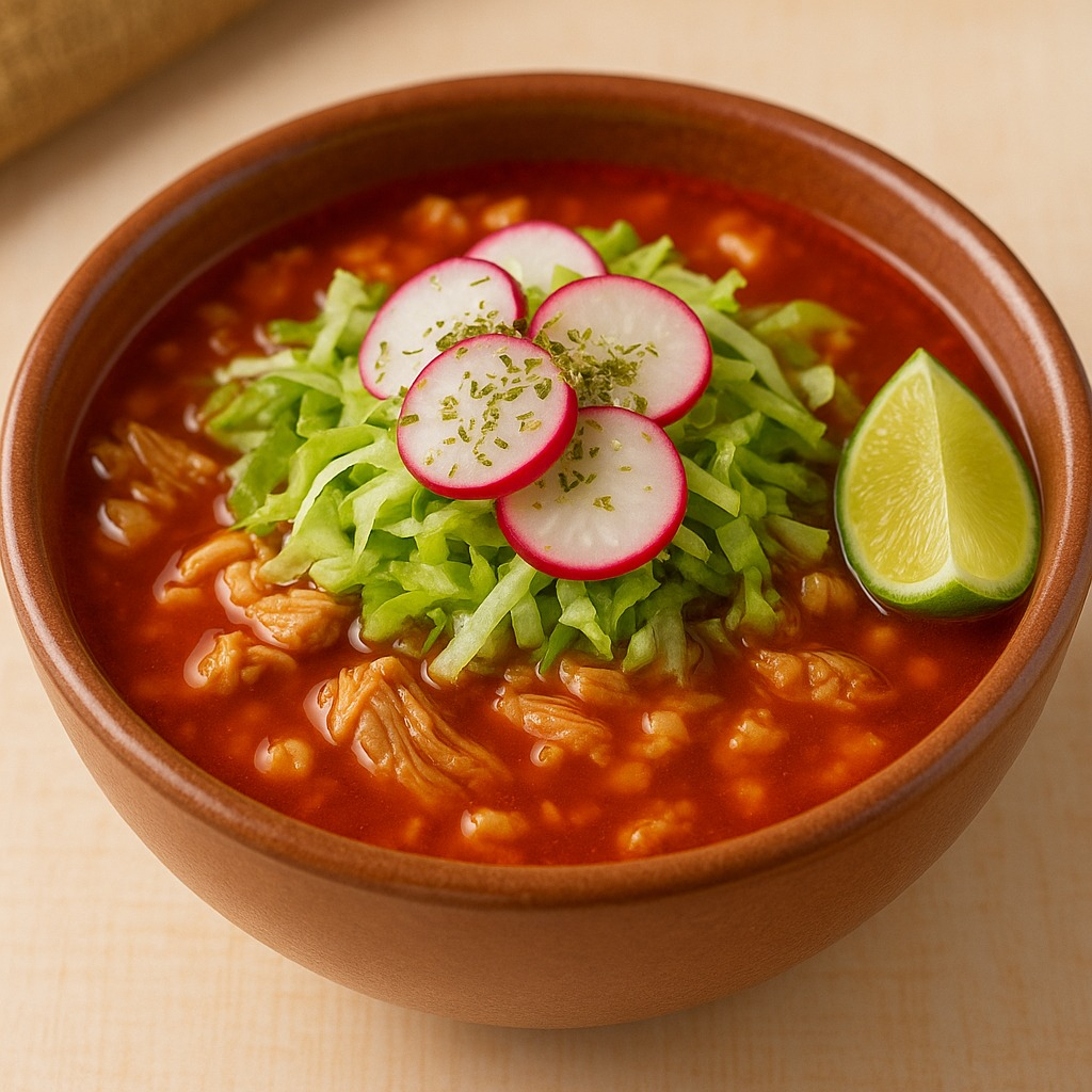 Delicioso pozole rojo tradicional en porción mediana de 600 ml, preparado con carne maciza suave y jugosa. Se acompaña con rábanos frescos, lechuga crujiente, cebolla picada, chile en polvo y tostadas doradas. Un sabor casero que nunca falla.