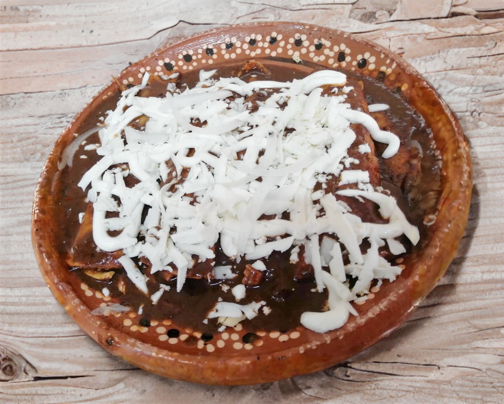 4 enchiladas de mole, con pechuga de pollo, crema, queso y cebolla.
