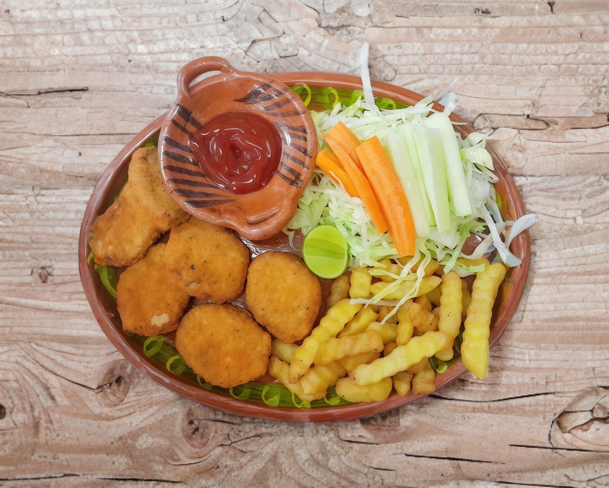 6 Piezas de Nuguets de Pollo acompañado de pepino y lechuga con Capsu y 200 gr de papas ala francesa