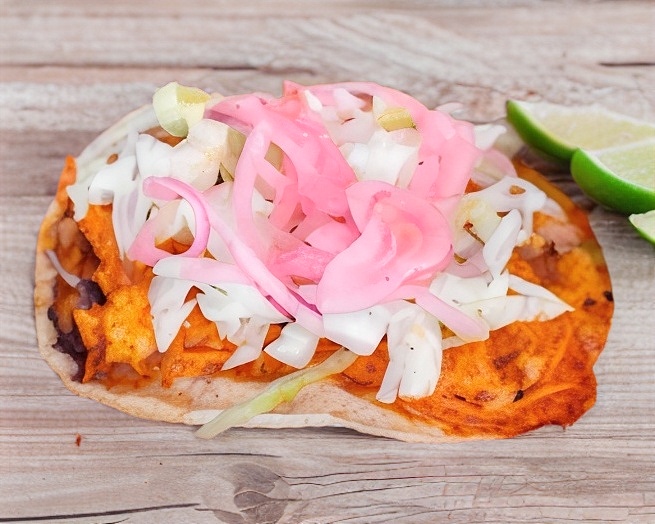 Suave tortilla de maíz rellena de jugosa cochinita pibil, acompañada de cebolla morada, salsa habanera y un toque de limón. Un bocado auténtico y lleno de sabor.