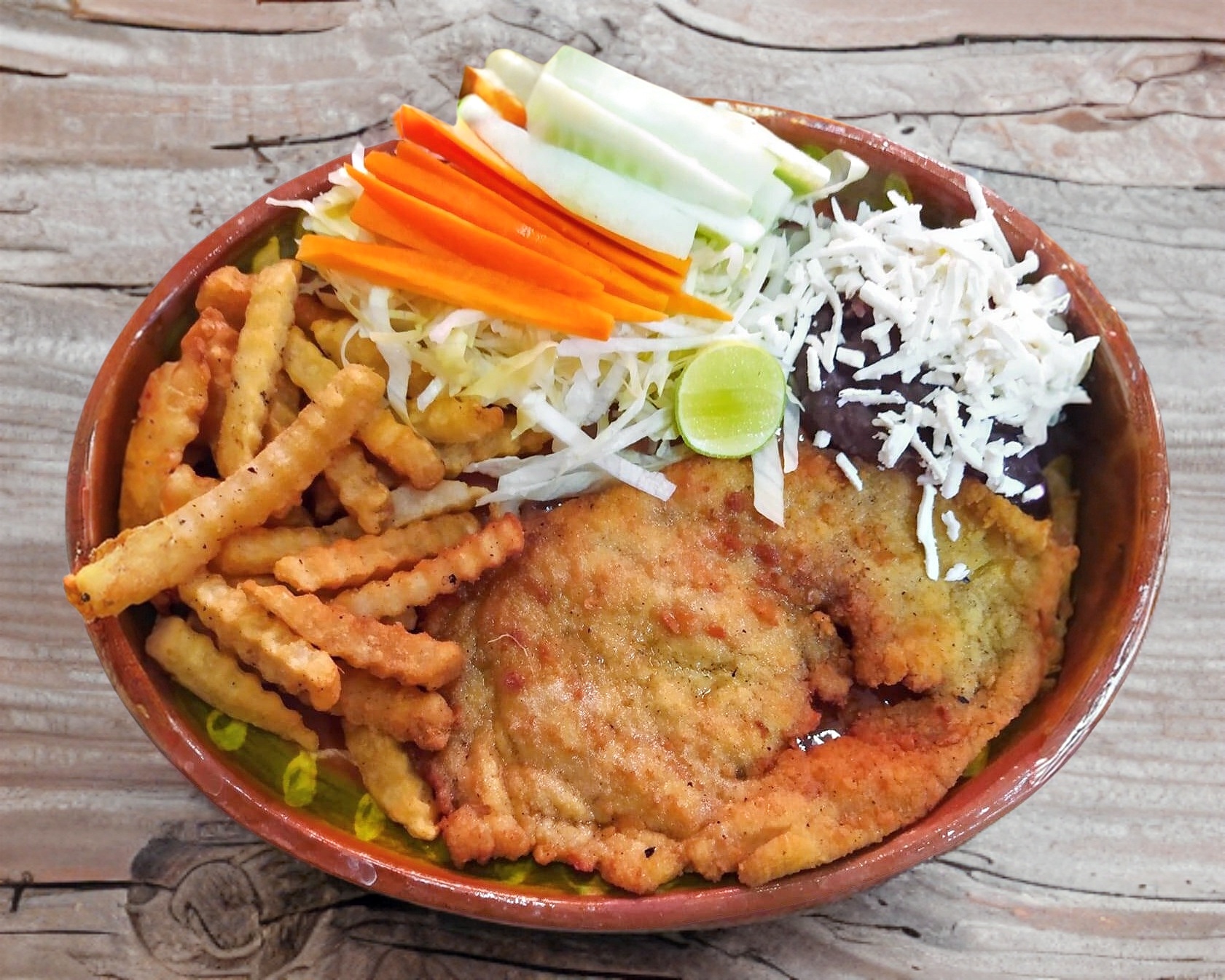 Milanesa de pollo con 200g de papas a la francesa ensalada y frijoles refritos
