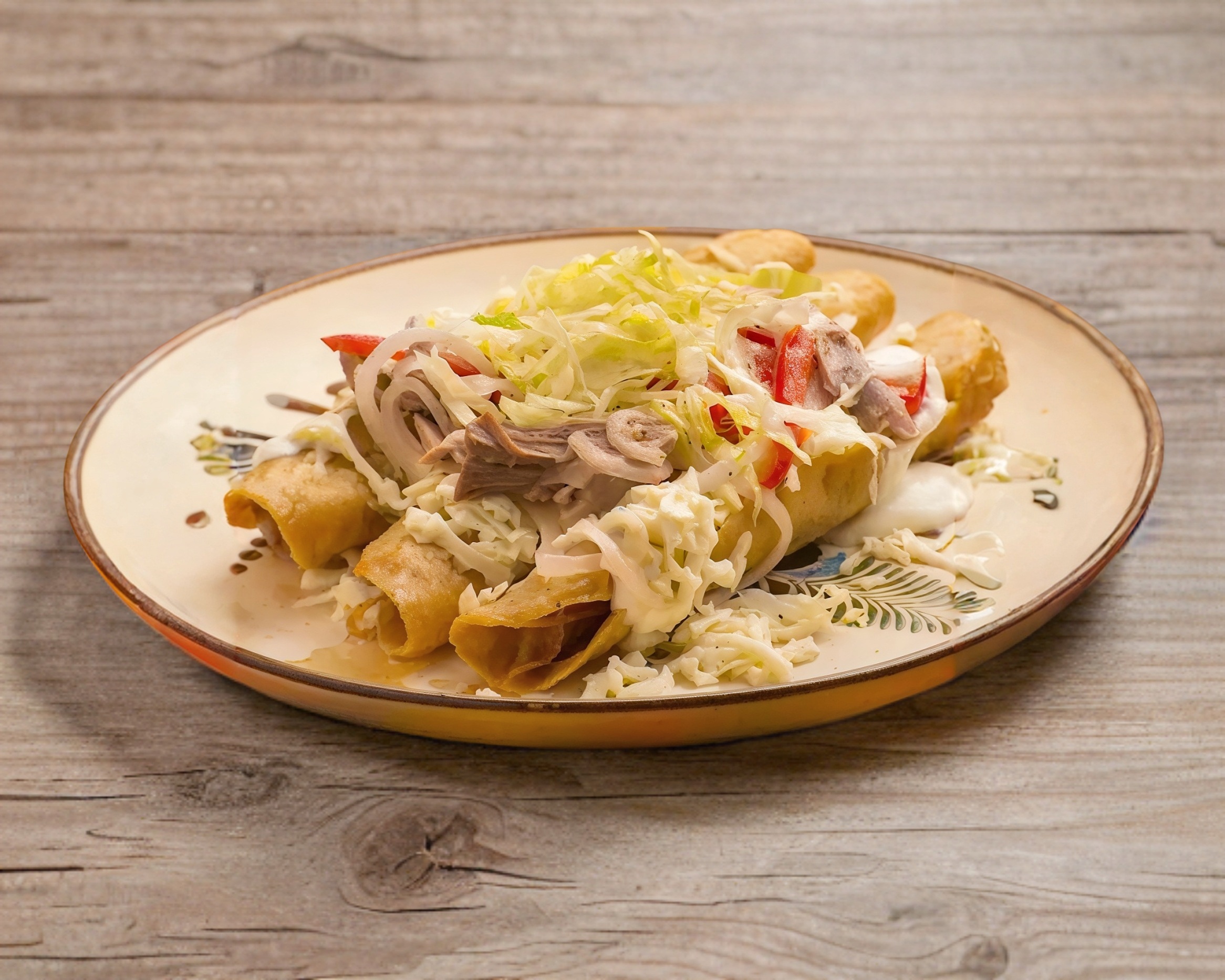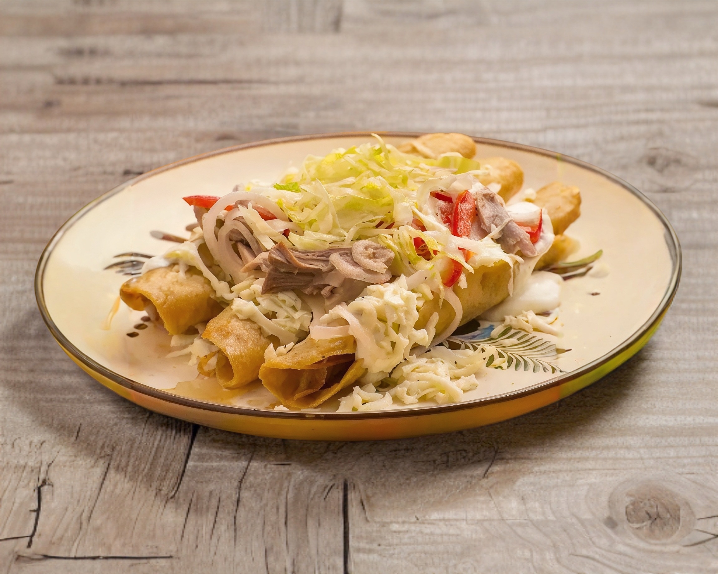 3 Flauta de Pollo, Lechuga, crema, queso y cebolla