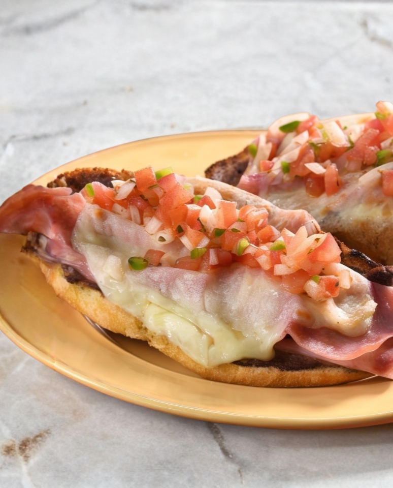 Orden de 2 molletes, con jamón, queso y salsa pico de gallo.