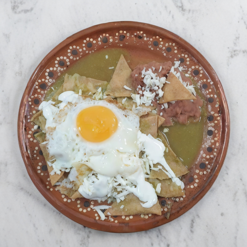 Chilaquiles verdes con crema, queso, cebolla, 1 bolillo y frijoles.