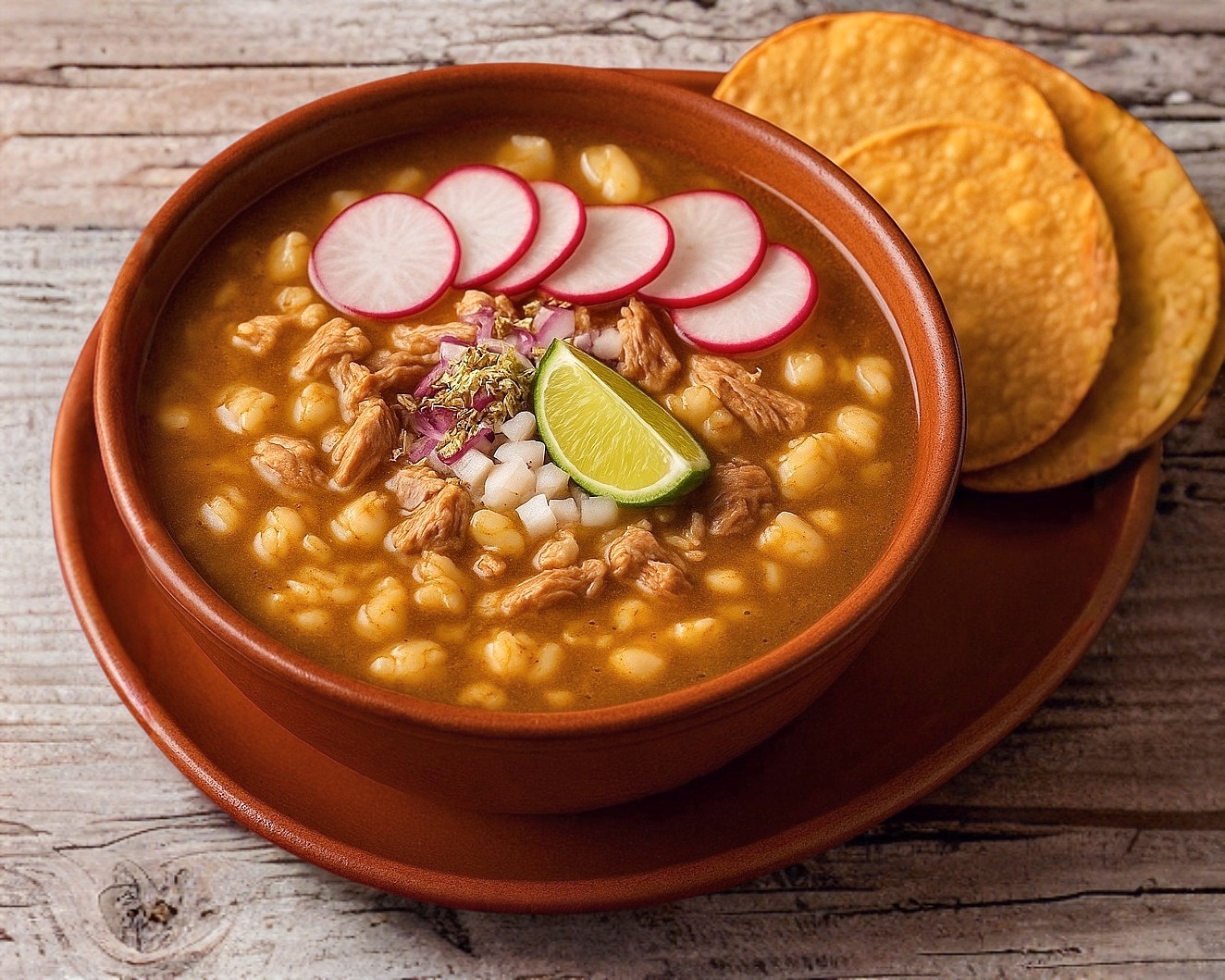 Delicioso pozole blanco tradicional en porción grande de 1 litro, preparado con carne de pollo suave y jugosa. Acompañado con rábanos frescos, lechuga crujiente, cebolla picada, chile en polvo y tostadas doradas. Un clásico mexicano lleno de sabor casero, perfecto para disfrutar en cualquier ocasión.