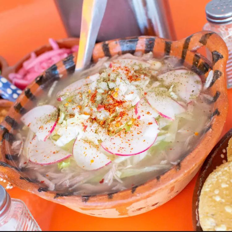 Delicioso pozole blanco tradicional en porción grande de 600ml , preparado con carne de pollo suave y jugosa. Acompañado con rábanos frescos, lechuga crujiente, cebolla picada, chile en polvo y tostadas doradas. Un clásico mexicano lleno de sabor casero, perfecto para disfrutar en cualquier ocasión.